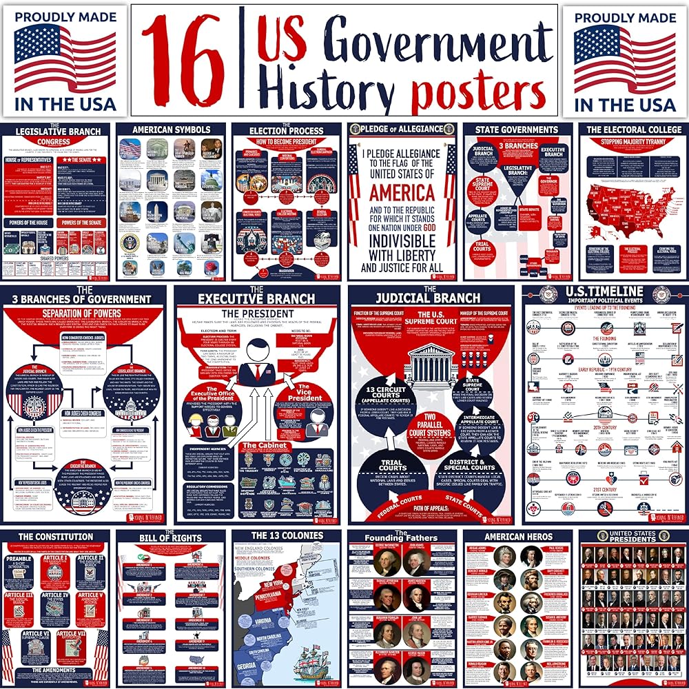 Enhance your space with this set of 16 vibrant, glossy posters, each measuring 12.5x18 inches, designed to educate and inspire. Perfect for classrooms, offices, or bulletin board displays, these posters cover essential aspects of U.S. government and history. Topics include the Legislative Branch, American Symbols, Election Process, Pledge of Allegiance, State Government, and the Electoral College. Learn about the 3 Branches of Government and their checks and balances, the roles within the Executive Branch, and the structure of the Judicial Branch. Additional posters feature a Timeline of Important Events, the Constitution, Bill of Rights, the 13 Colonies, Founding Fathers, American Heroes, and U.S. Presidents. These posters are visually appealing and durable, making them an ideal addition to any educational setting, helping to foster a deeper understanding of American history and government.
