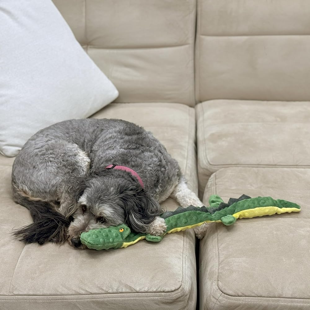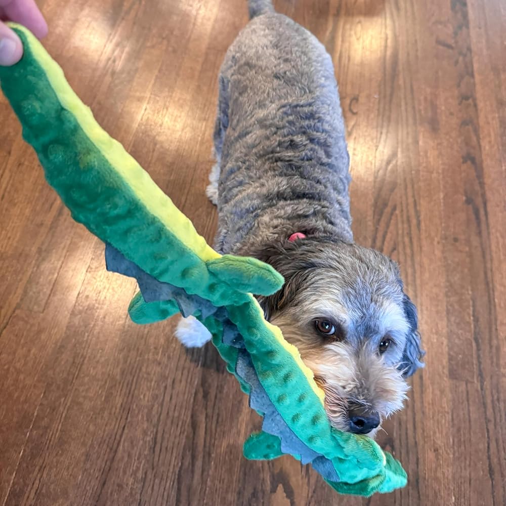 The SPOT Skinneeez Extreme Triple Squeak Snake Large Dog Toy is a durable option for dogs who enjoy tugging and chewing. Made without stuffing, it reduces the chances of your dog tearing it apart and creating a mess.