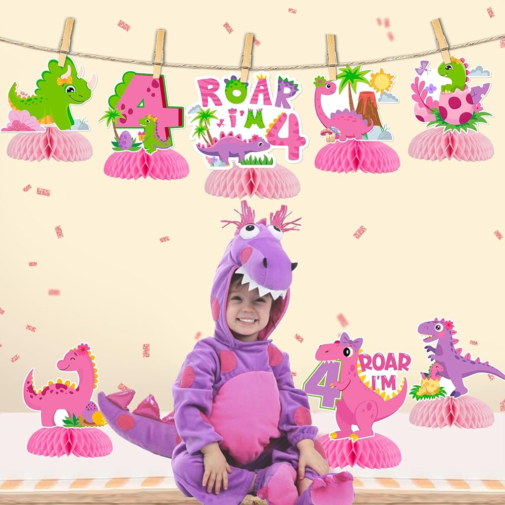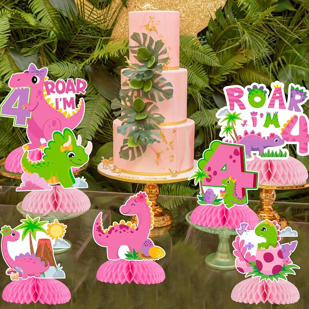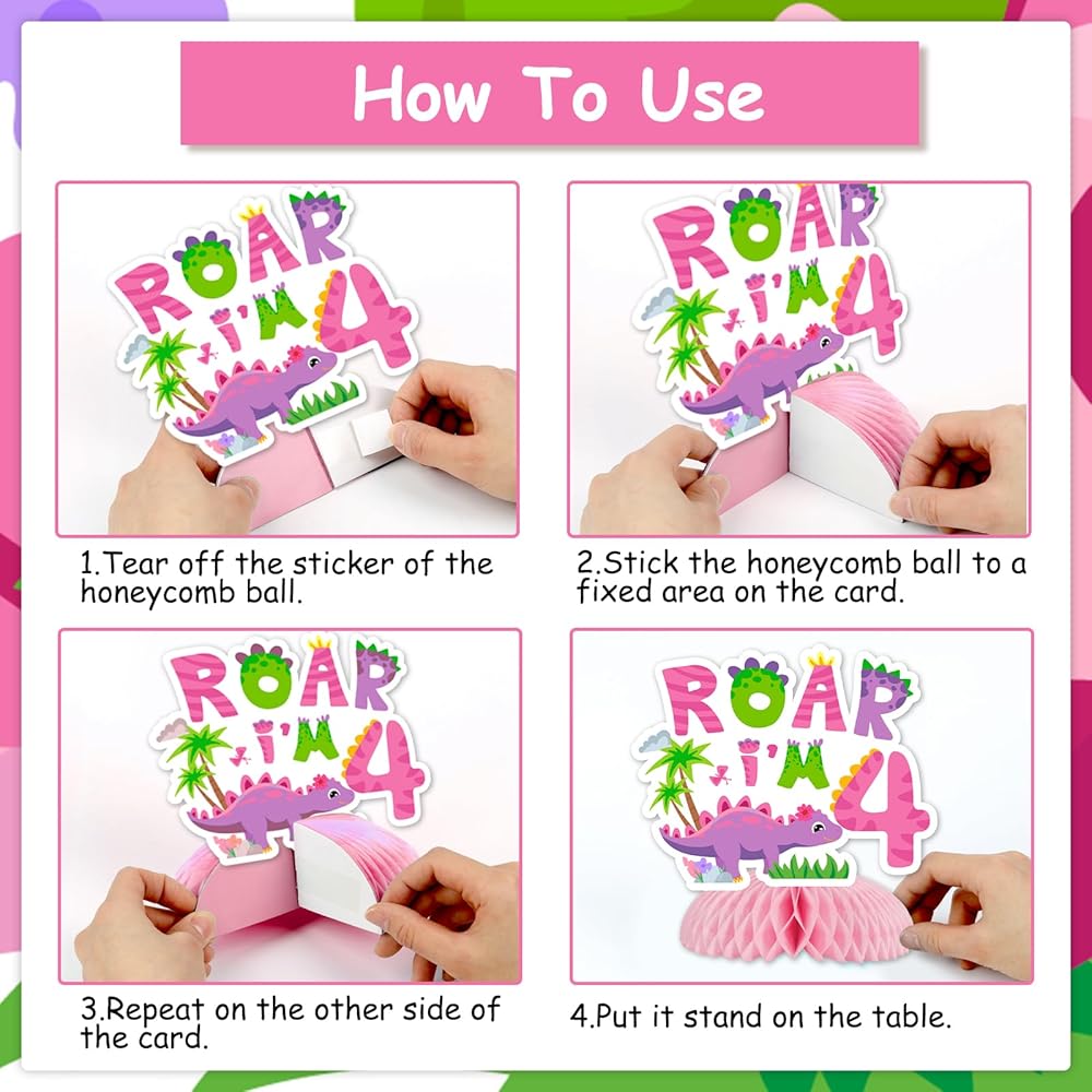 Rawr Im 4 Dinosaur Party Decorations: This product is designed for dinosaur 4th birthday party decorations, suitable for girls. The dinosaur 4th honeycomb centerpieces are mainly in pink, the favorite color for little girls, surely bringing so much fun for your daughter.