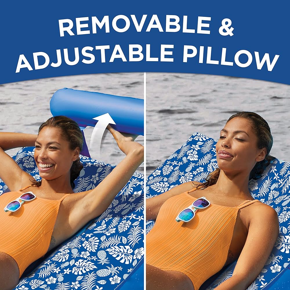 Ultimate comfort: Pool float with ergonomic shape and head rest pillow includes built-in boarding handles and beverage holder