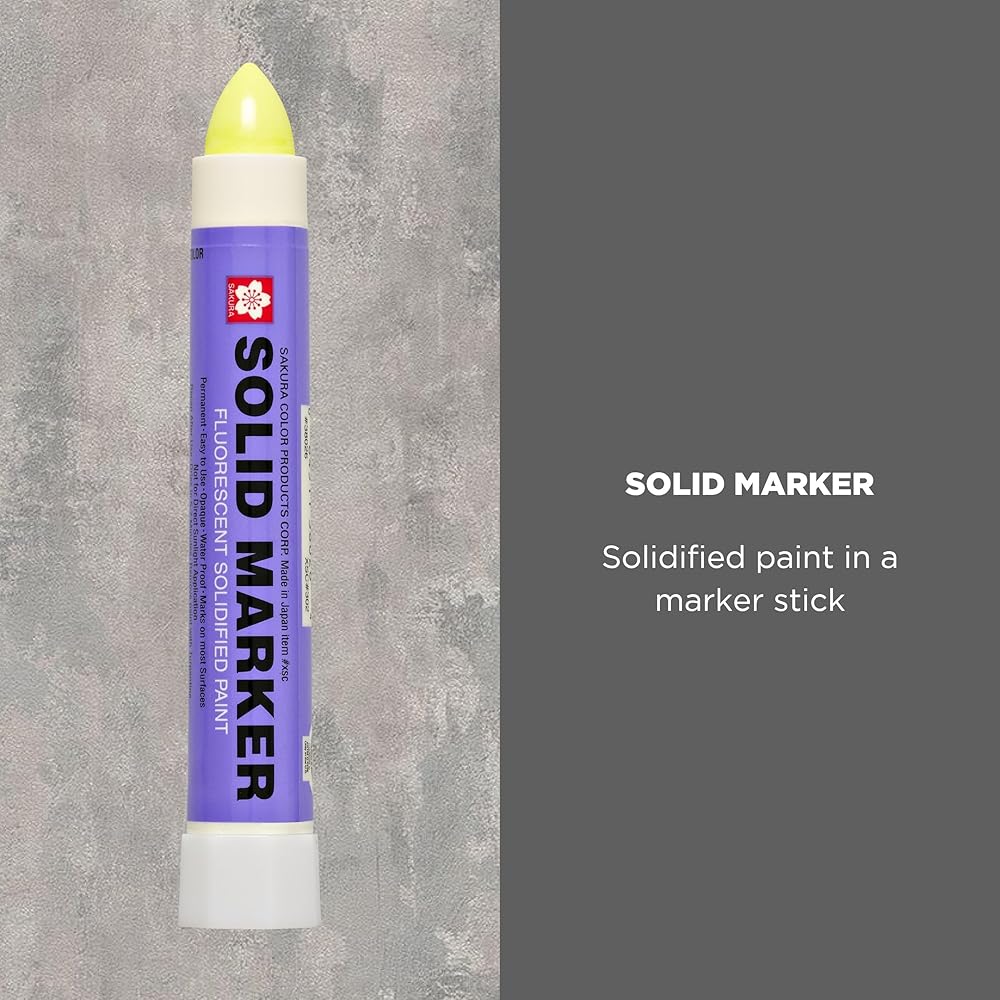 Sakura tough marker for tough jobs, the Solid Marker is solidified paint in a marker stick. It marks through oil, grease, rust, mud, snow-inside or outside. Dries within minutes, and is permanent once dry. Solid Markers won't fade or wash off like chalk. The special "stay fresh" twist mechanism keeps paint fresh and ready to use. Ideal for use on wood, cloth and canvas, plastic, steel and iron, rubber, cardboard, glass, fiberglass and concrete. Solid marker features a tough, broad stroke, is quick-drying and virtually odorless. This marker is widely used in commercial and industrial applications in construction, welding and fabrication, pipelines and drilling, assembly lines, automotive tires and windshields, HVAC, plumbing systems or with stencils. Working temperature range: 14 to 392 degrees F 13 mm wide mark can be trimmed with knife for smaller marks. Alcohol based cleaners will remove ink from non-porous surfaces. Meets ASTM and ACMI non-toxicity standards, and is AP seal certified.