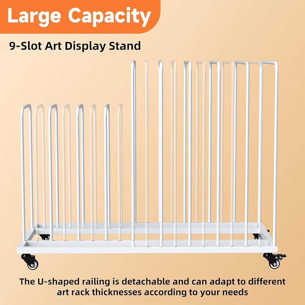 Widely Application: The metal art rack is suitable for organizing canvas panels, storing or drying canvases, picture frames, posters, prints, panels and other artwork. This is also a great way to display original pieces & prints for vending at art fairs. This painting storage rack for framed art is beautiful and practical for use in painting studios, galleries, school art rooms, home studios, museum galleries and other scenes