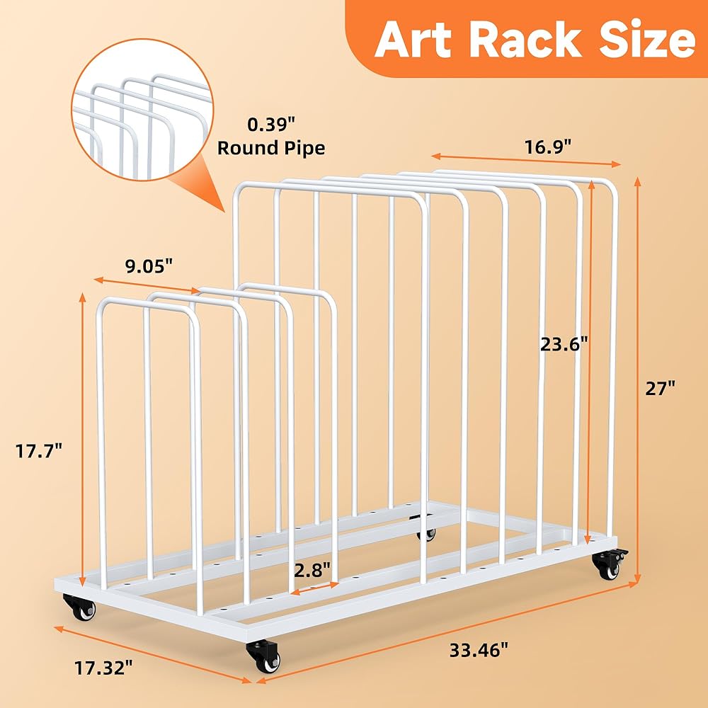 Fits Most Sizes of Artworks: This storage rack is perfect for larger canvases and art pieces. The overall size of the canvas rack art storage is 17.3x33.5x27 in and suitable for most canvas sizes (10~40 in), after installation of the finished easel, there are a total of 9 placement slots with large storage capacity for multiple layers of canvas