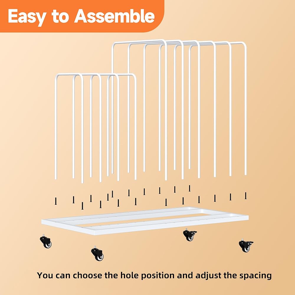 Easy to Assemble: The framed art storage rack has a total of 6 tall U-shaped iron pipes, 4 short U-shaped iron pipes, 1 base, 4 casters (2 of them with brake casters), a package of screws, a person can also easily complete the assembly of the canvas art storage rack, note that there are 38 round mounting holes on the base, and the spacing of each U-shaped pipe can be adjusted according to the needs of the user, which is convenient for you to disassemble and use flexibly