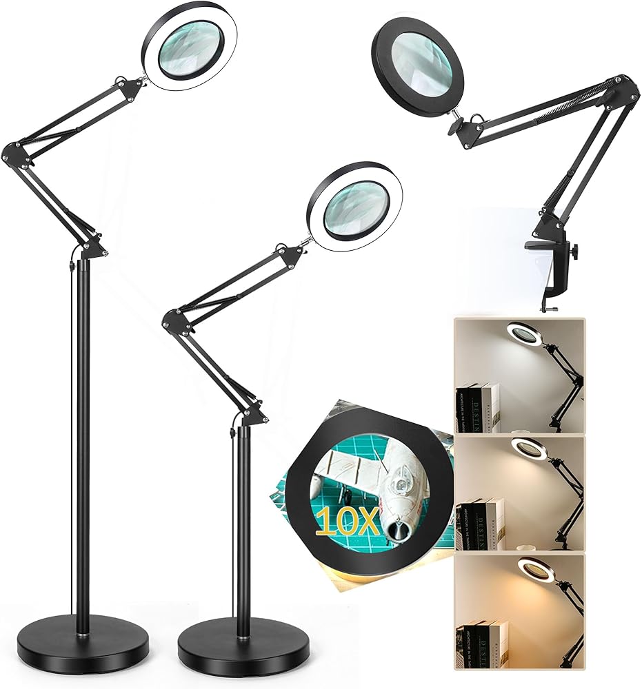 10X Magnifying Glass with Light and Stand, 3-in-1 Magnifying Floor Lamp Adjustable Swing Arm Stepless Dimmable 3 Color Modes, LED Lighted Magnifier for Close Work Reading Repair Painting Crafts