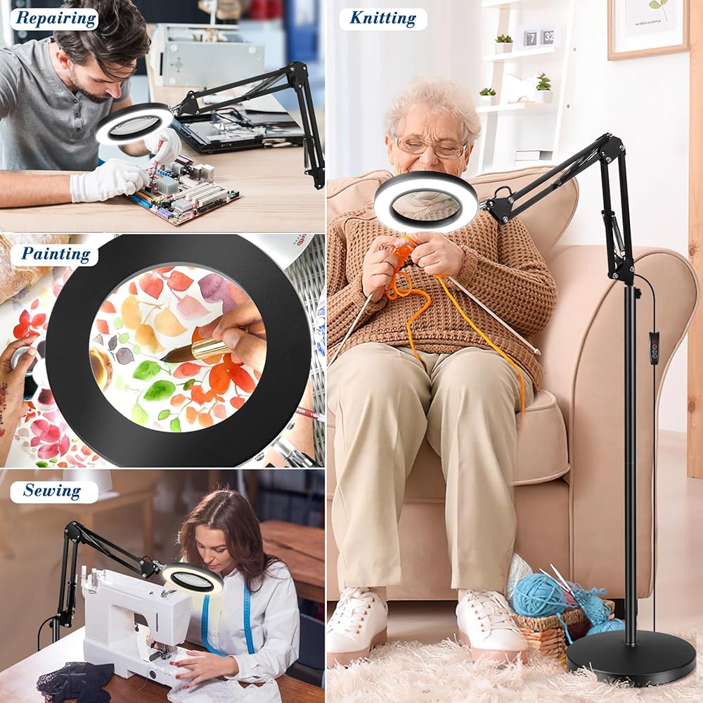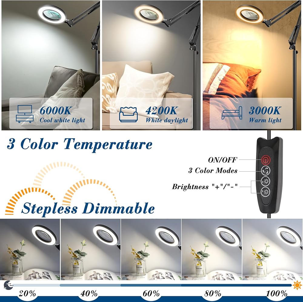 Eye Protection & Bright Magnifying Floor Lamp - We pay attention to customers' healthy reading. This lamp has SMD LED, provides more evenly lit viewing area. The lighting modes adjuster allows you to choose warm white or daylight, no strobe and glare, protects your eyes and reduces eyes strain. Create an environment for book lovers, repairmen, soldiers, aestheticians, jewelers, artists, architects, coin collectors, sculptors, etc.
