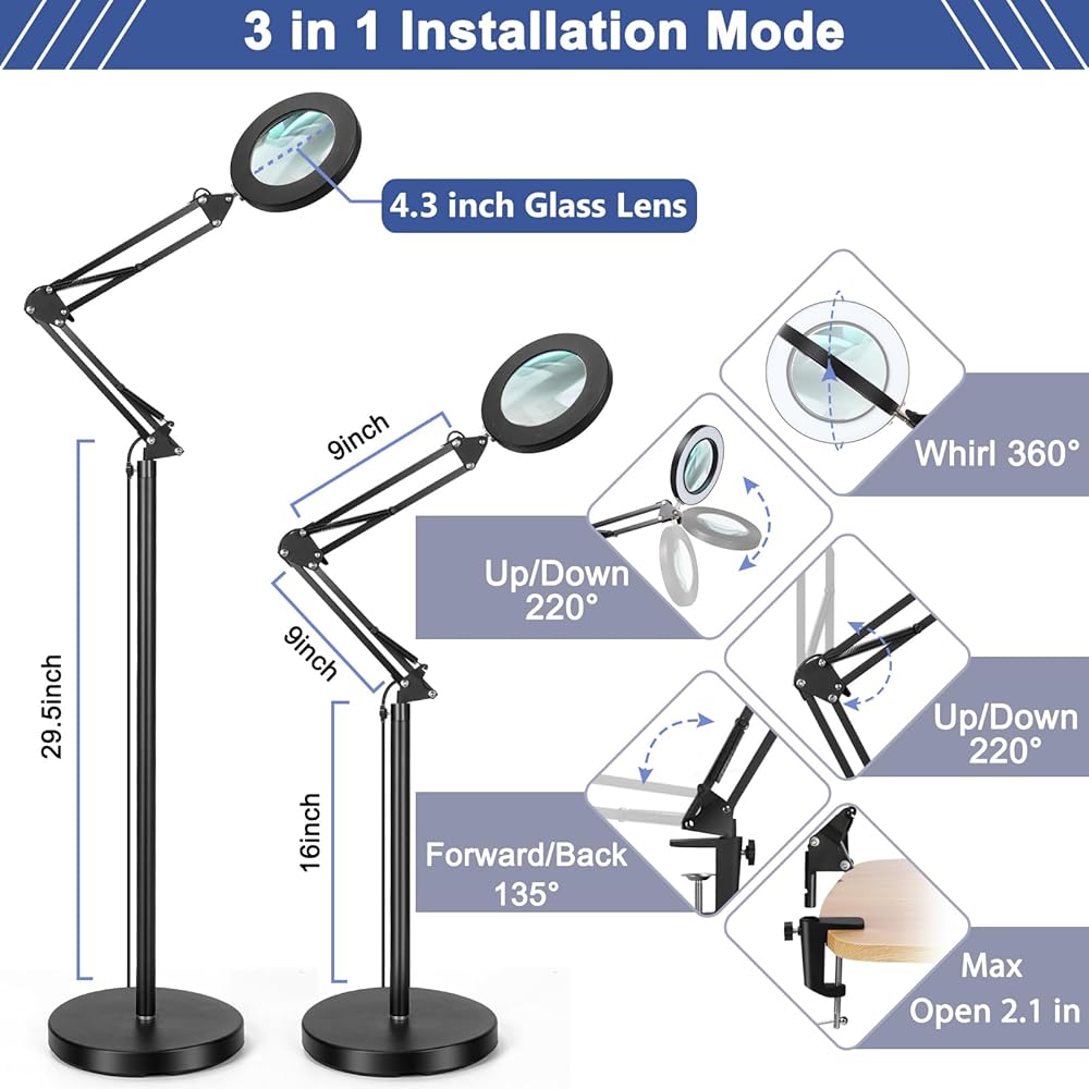 3-IN-1 Design, Simple Combination - TOMSOO magnifying floor lamp is designed for users reading or working comfortably and conveniently. The magnifier with light and stand adjusted to three different heights. Adapt to your needs for different use scenarios. The heavy base ensures the light doesn't tip that you can enjoy comfort with close work. Take out the swing arm lamp and put it in the fixture clamp, which becomes an LED magnifying lamp with clamp (Max up to 2.1'' tabletop). Widely used at desks, tables, workbenches, shelves, etc