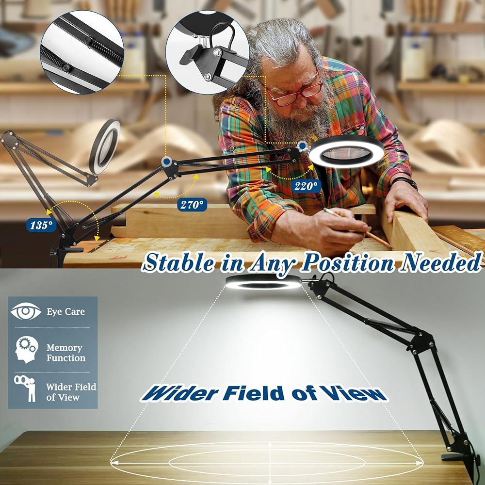 Hands-Free Adjustable Swing Arm - The magnifying desk lamp has two adjustable swing arms, which greatly meets the needs of long-distance workbenches. Equipped with 4 strong springs and 3 knods on the arm, it provides firm support to prevent sagging and hold the illuminated lens in place. Say goodbye to the hassle of holding the lens and enjoy smooth, effortless work. Repairman uses it for repairing electronics or watches, soldering. Artists and jewelers use it for painting, jewelry, hobby, fly tying, crafting, needlework, embroidery, beading, etc