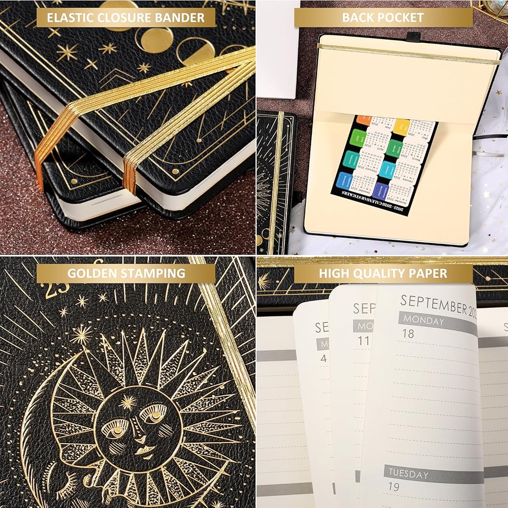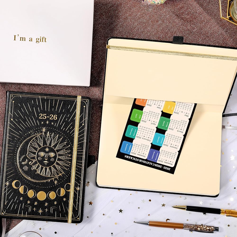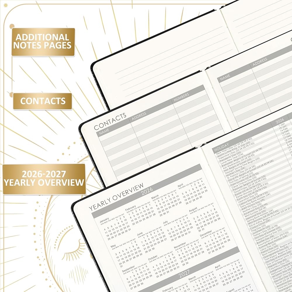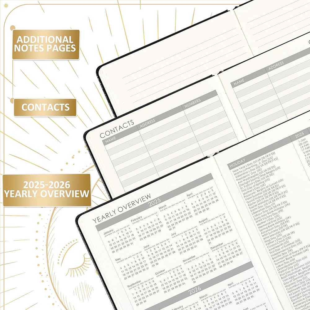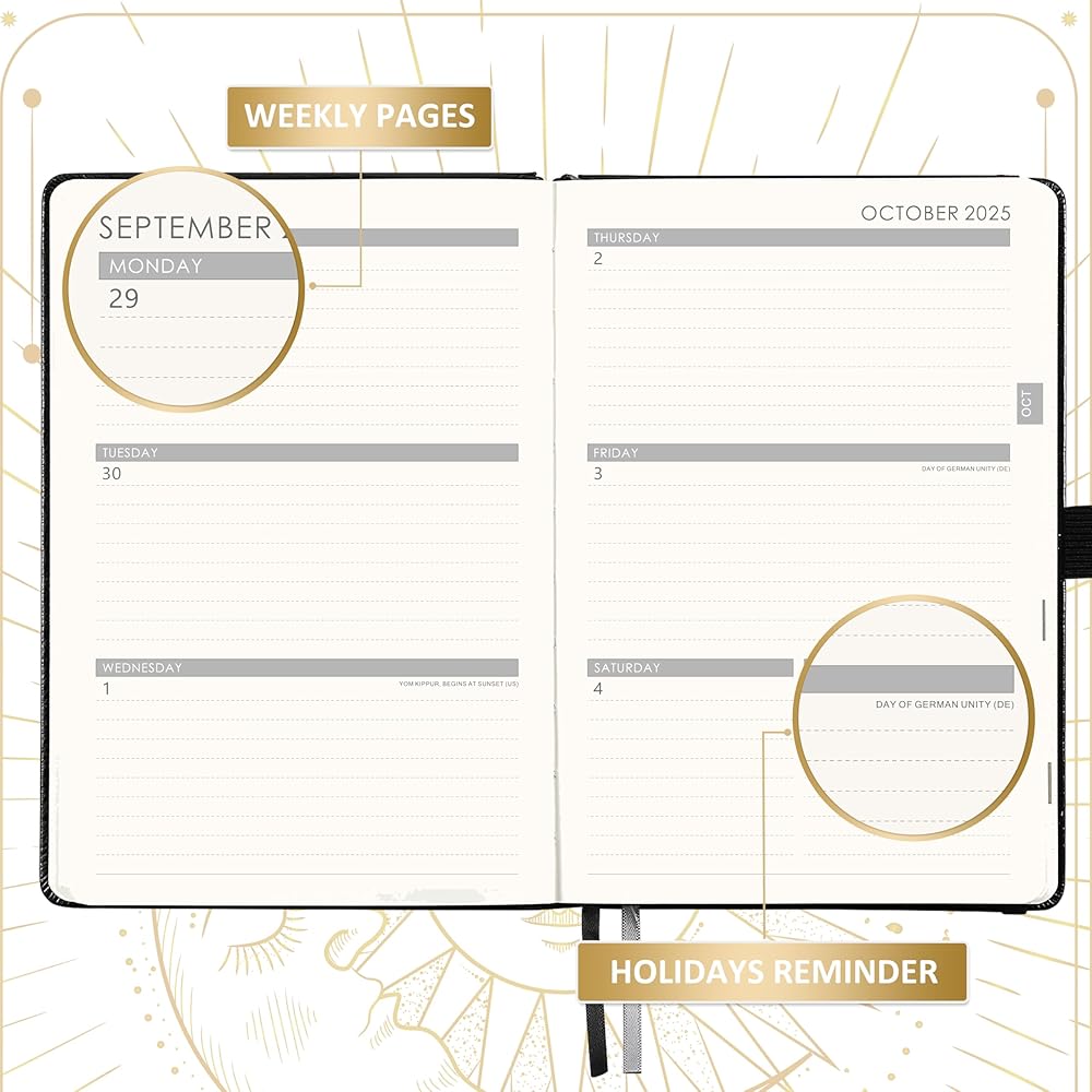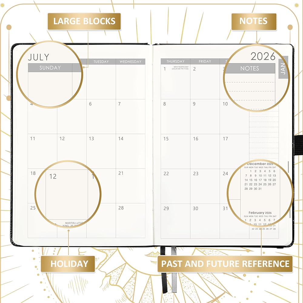 SUPERIOR QUALITY - Durable faux leather cover, excellent texture. 2025-2026 yearly holidays lets you master the holidays clearly. The planner offers unruled monthly pages/ruled weekly layouts for detailed planning.