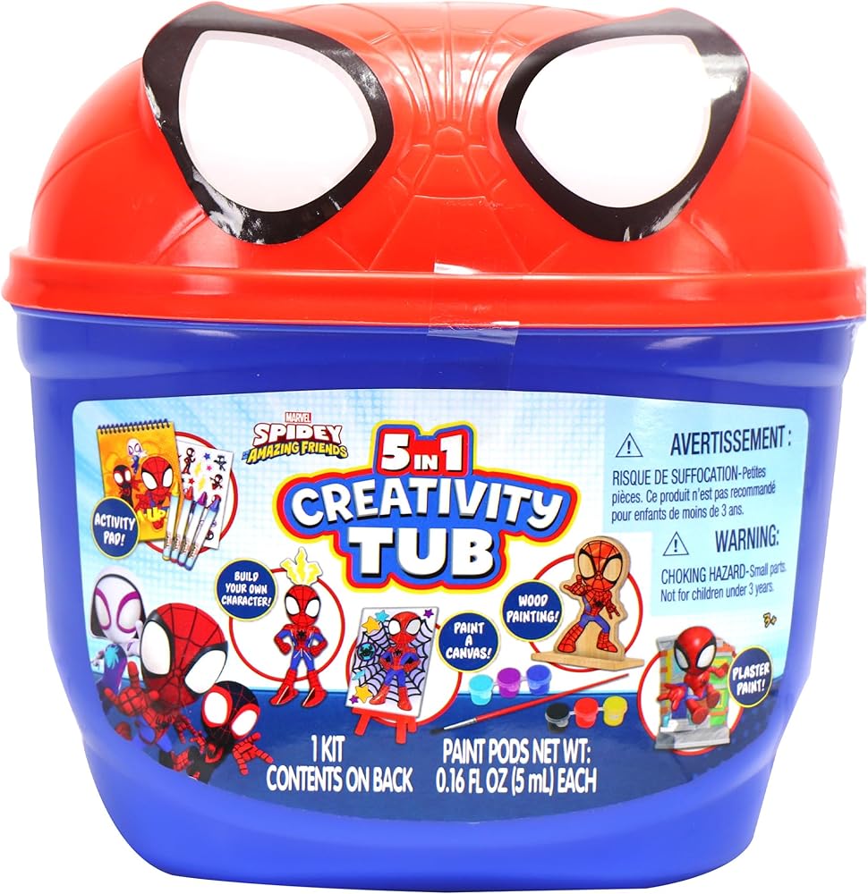 Get ready for kids' arts and crafts kit exploration with the Disney Junior Minnie Mouse 5 in 1 Creativity Tub. The fun begins with a bow-tastic mouse-eared tub. Look inside to discover lots of things to do. Find a plaster Disney Minnie Mouse figure, an outlined canvas, and wooden figure on a stand to paint, an activity pad with sheets to color and decorate with stickers, and a Minnie Mouse necklace to design and assemble. Display the canvas on the easel – or the wooden character on a desk. With so much to do and play with, fans of Minnie Mouse will be busy with lots of crafts to design, build, and share. This imaginative 5 in 1 Creativity Tub makes a great rainy day activity, birthday surprise, or party prize for kitty-loving kids ages 3 years and up.