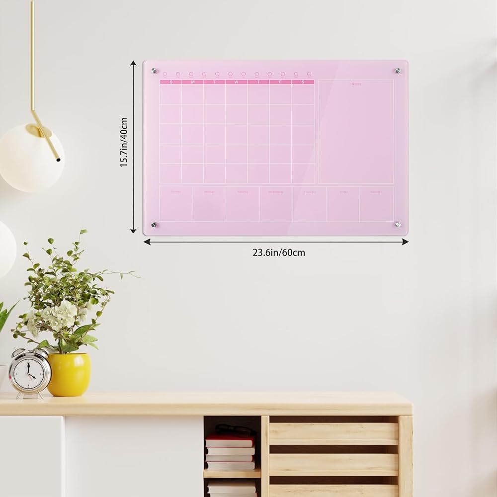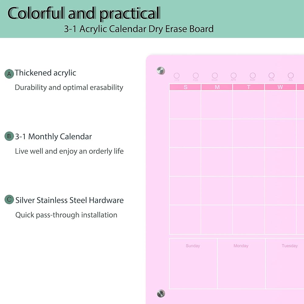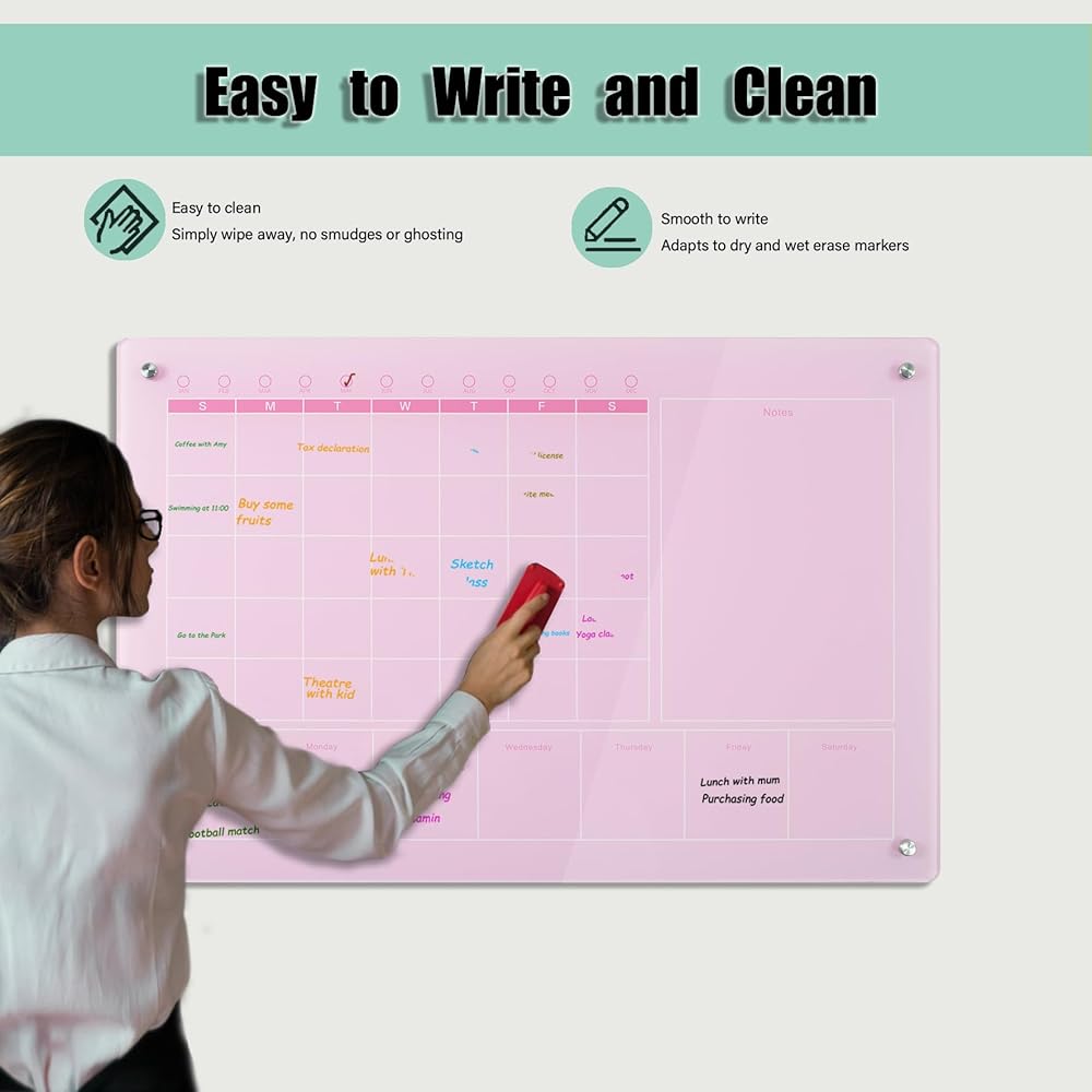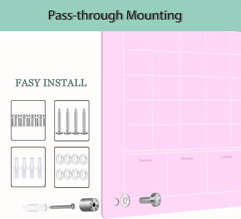 [Premium Quality] Acrylic wall calendar is 24"X16" in size and is made of high-quality transparent acrylic with a thickness of 1/5''. It is strong and durable and comes with 5 pairs of metal mounting accessories ( markers not included)