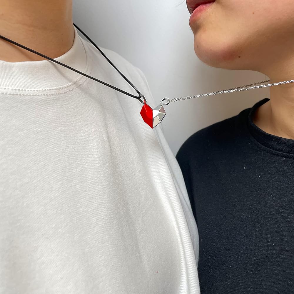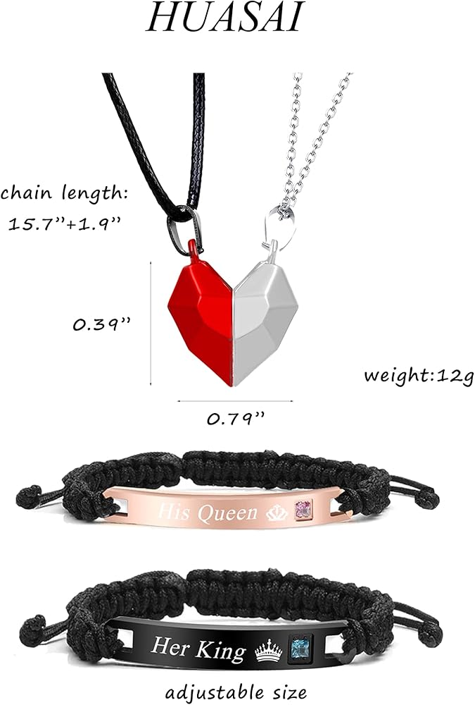 MATCHING HEART NECKLACES FOR COUPLES: You will get 1 pair of couple necklaces and 1 pair of pulseras para parejas set. The necklaces set is two matching heart pendants. The pulseras para parejas are matching braided rope bracelet, which engraved promise words. This is an excellent proof of the intimacy between you, and you can't miss it.