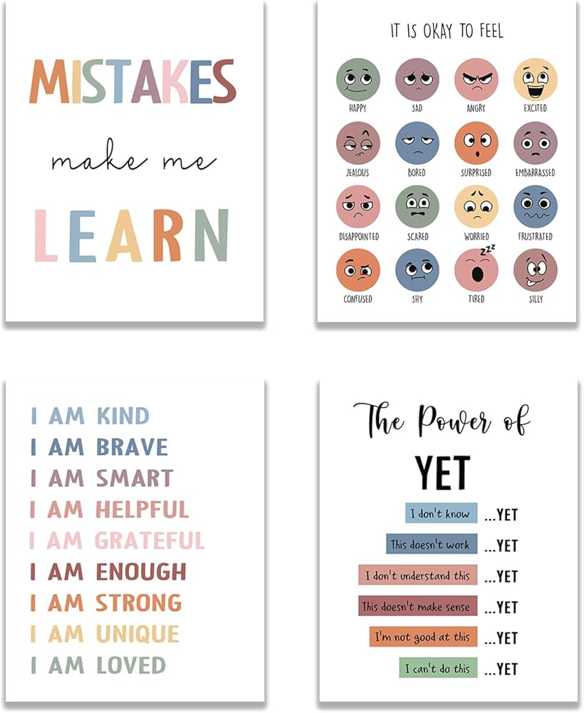KEUSPI Mental Health Positive Feelings Boho Educational Wall Art Poster Prints Posters For Kids Classroom Therapy Office Counseling Decor,Psychology Decorations Prints Unframed 8x10 Inches Set of 4