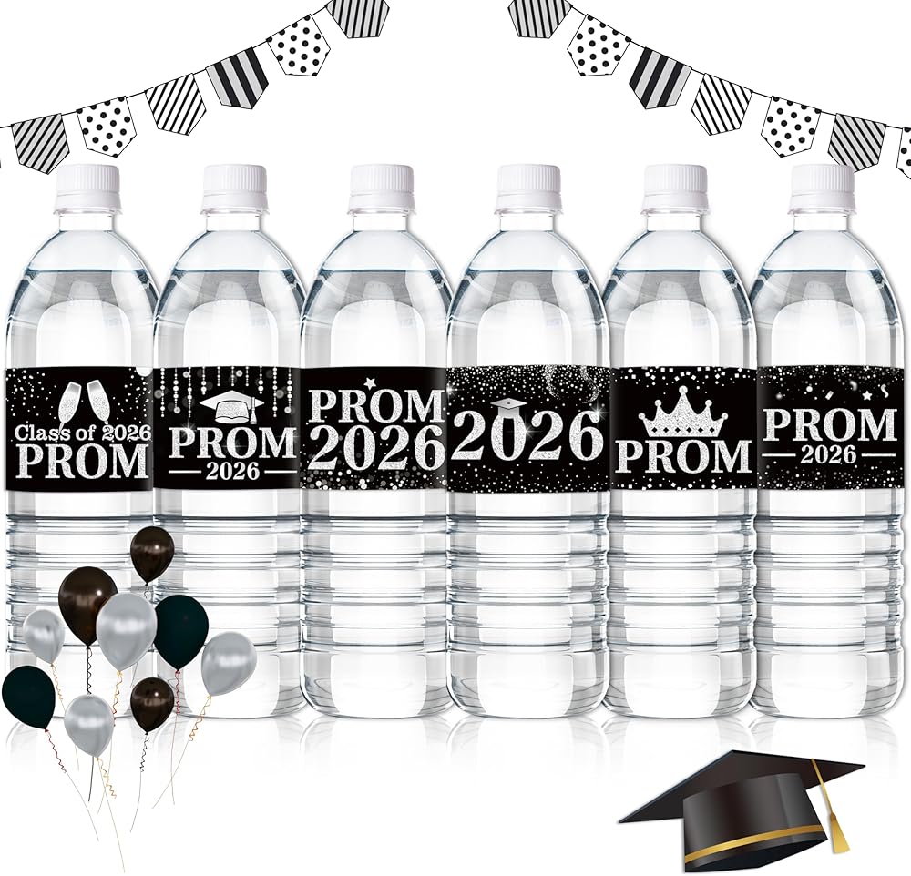 Graduation Prom Water Bottle Label - COcnny 120pcs Prom Party Decorations Stickers Congrats Grad Supplies, Class of 2026 Bottle Wrappers Sticker Decor for College School Celebration (Black Silver)