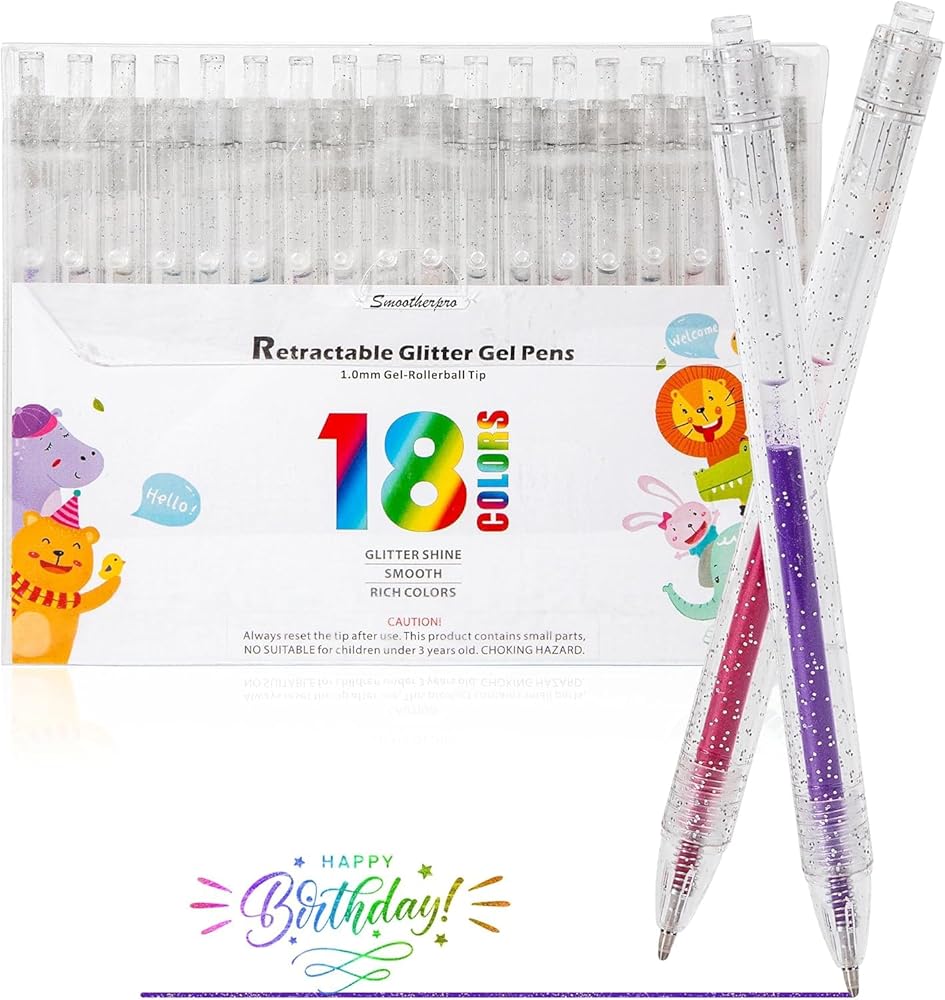 SMOOTHERPRO Glitter Retractable Gel Pens 18 Colors Metallic Colored Gel Pen 1.0 mm Bold Silver Glitter Gel Ink for Adults Coloring Journaling Drawing Doodling (GRP018N)