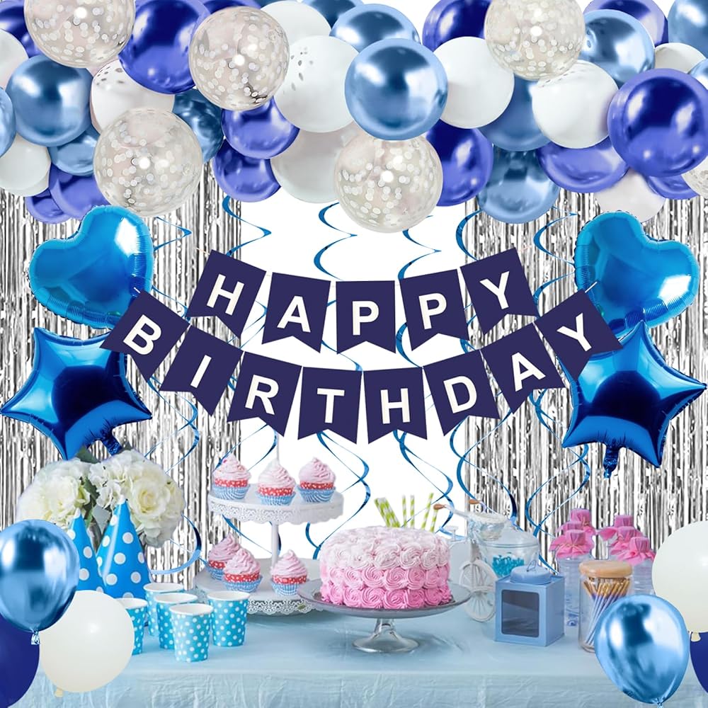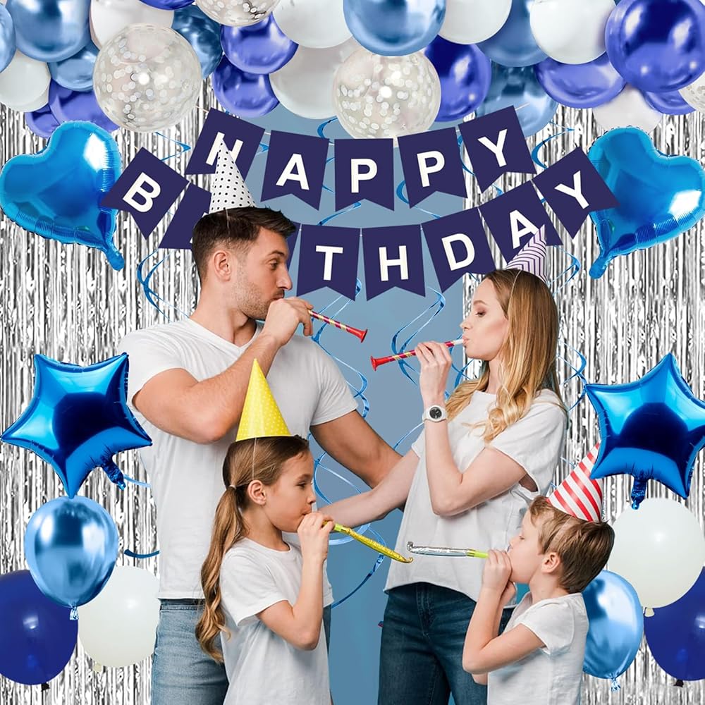 VALUE SET: Our blue birthday decorations include 1 x happy birthday banner, 2 x silver fringe curtains, 6 x blue hanging swirls, 2 x love heart aluminum balloons(18in), 2 x five-pointed star aluminum foil balloons(18in), 10 x navy blue Balloons(10in), 10 x royal blue Balloons(10in), 10 x white balloons(10in), 5 x white sequins balloons(12in), 1 x dot glue and 1 x ballon tape. One pack meet all you need!