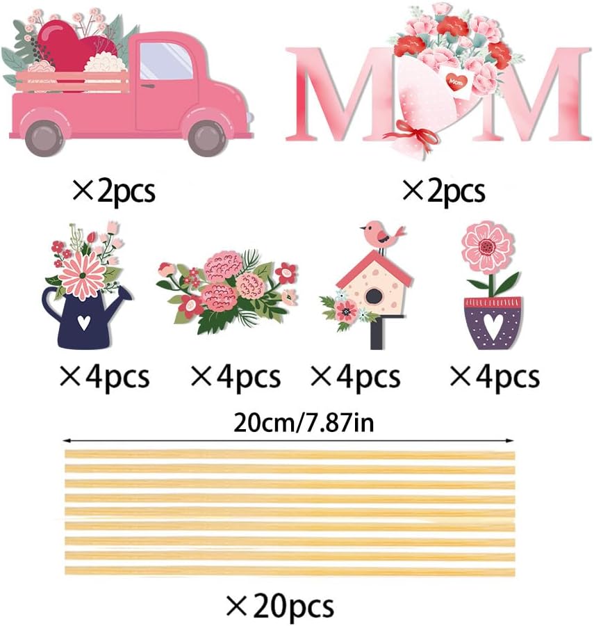 Package include: 4 flowers, 4 bird and house, 4 flower pots, 4 sprinkler with flowering plants, 4 love heart and flower cars, 4 flower and mum letter design.