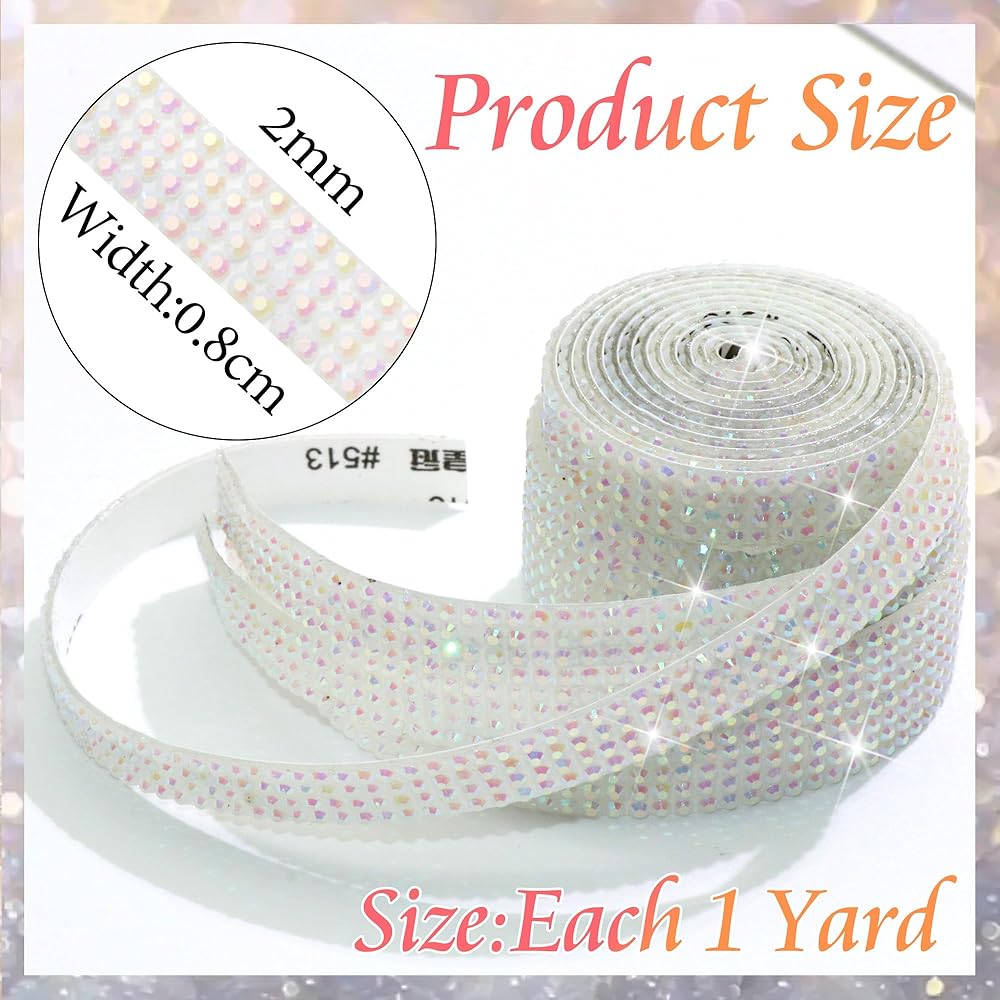 FULZTEY 4 Rolls Rhinestone Ribbon Roll,White AB Crystal Rhinestone Ribbon Sticker with 2 mm Rhinestone for DIY Crafts,Bling Jelly Self Adhesive Rhinestone Strips for Car Clothes Wedding Decoration