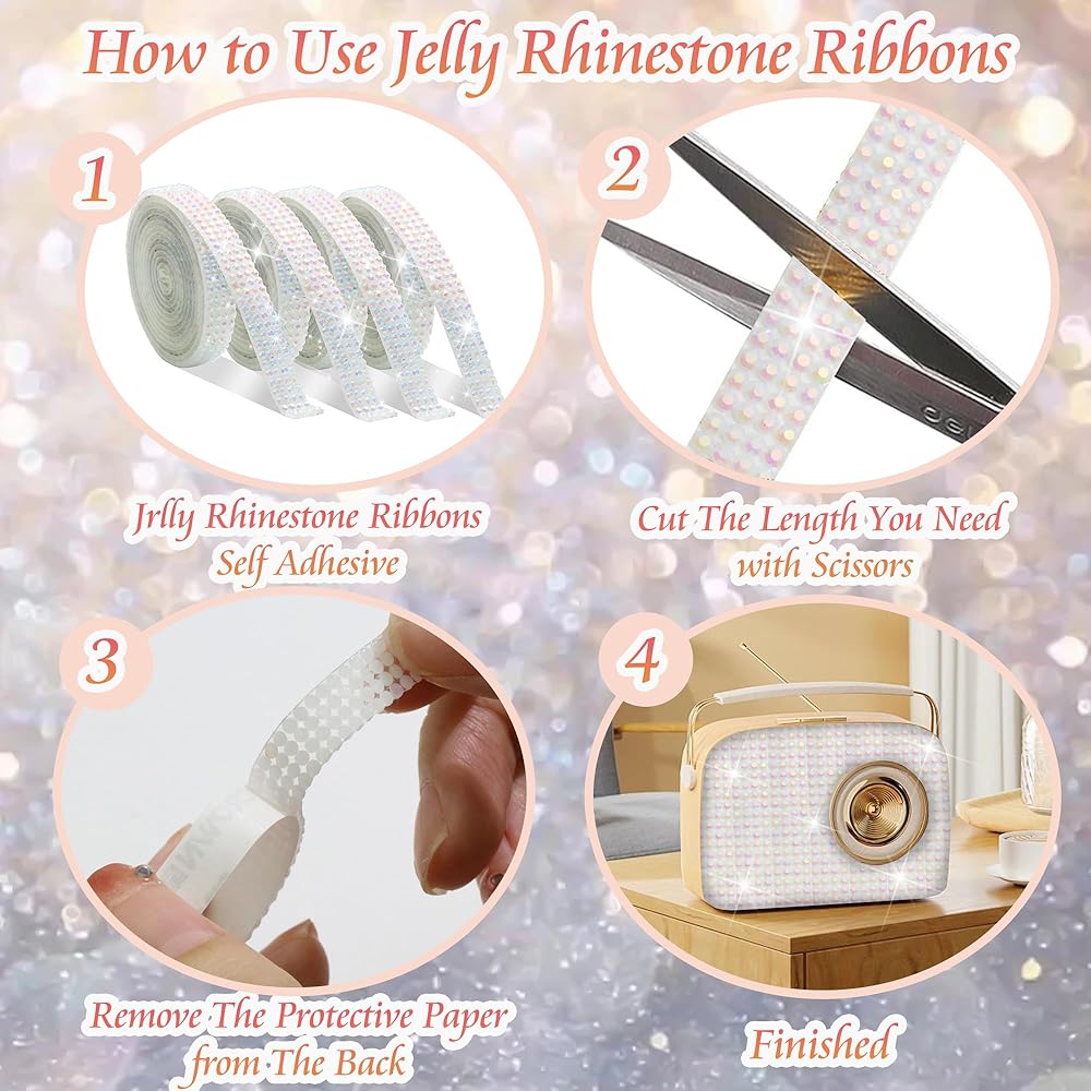 Package And Dimension:You Will Receive 4 Rolls White AB Rhinestones Ribbon Sticker Rolls with 4 Rows Jelly Rhinestones;And The Width of Bling Rhinestone Strips Is 0.8 cm/0.31 inches;You Can Use These Self Adhesive Sticker to Decorate Your Objects And Make Them More Exquisite