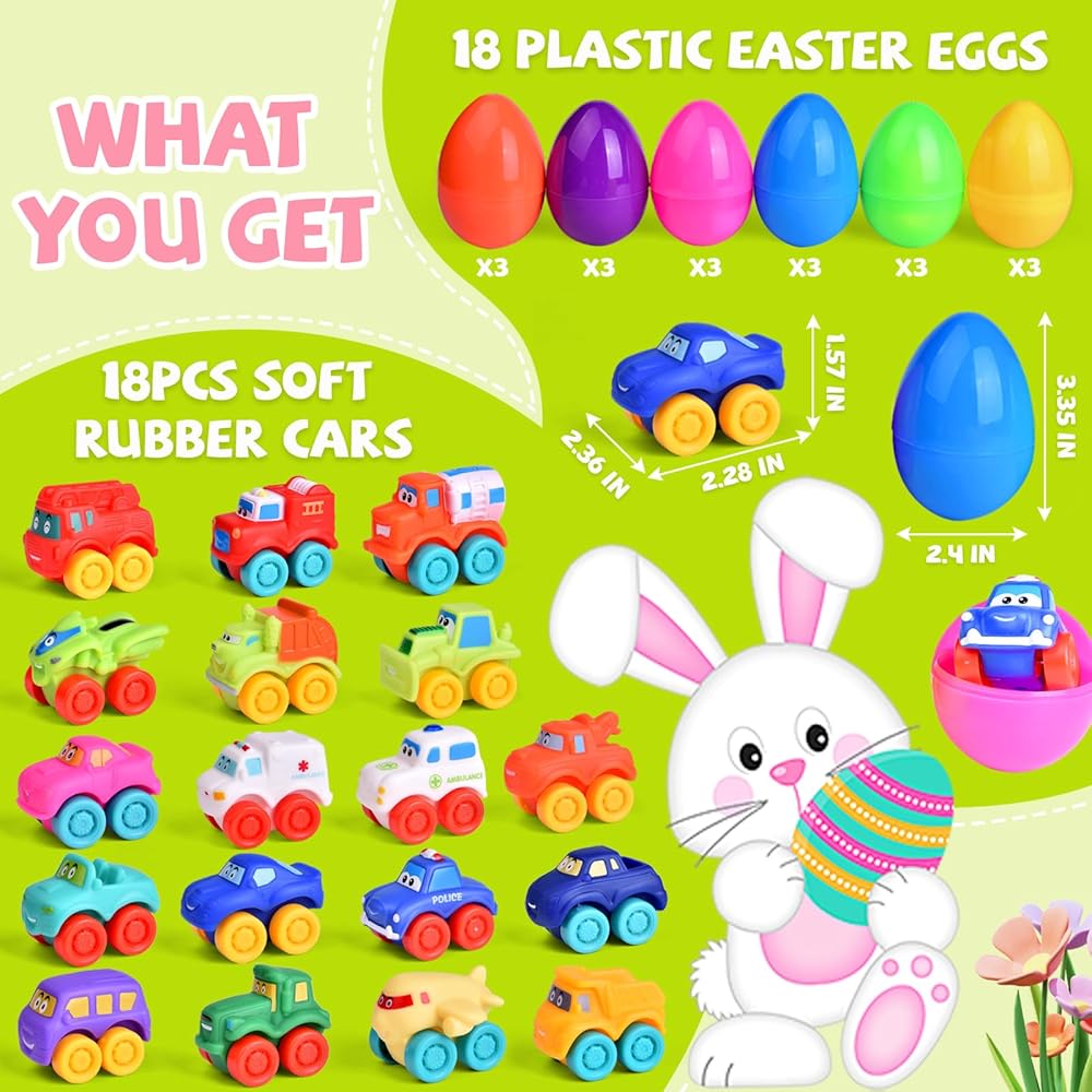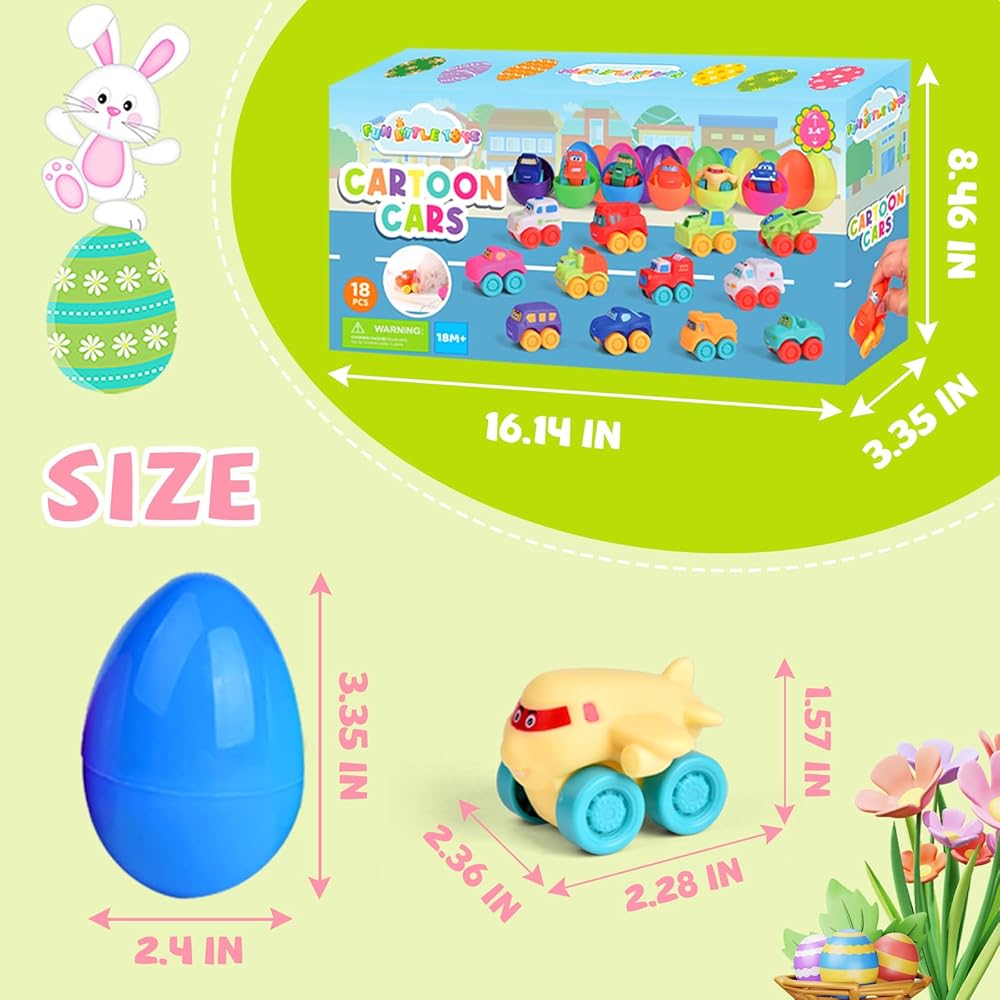FUN LITTLE TOYS 18Pcs Prefilled Easter Eggs with Toy Cars, Easter Eggs Filled for Toddlers Kids Boys Hunt, Easter Party Favors, Easter Basket Stuffers, Easter Egg with Kids Toys