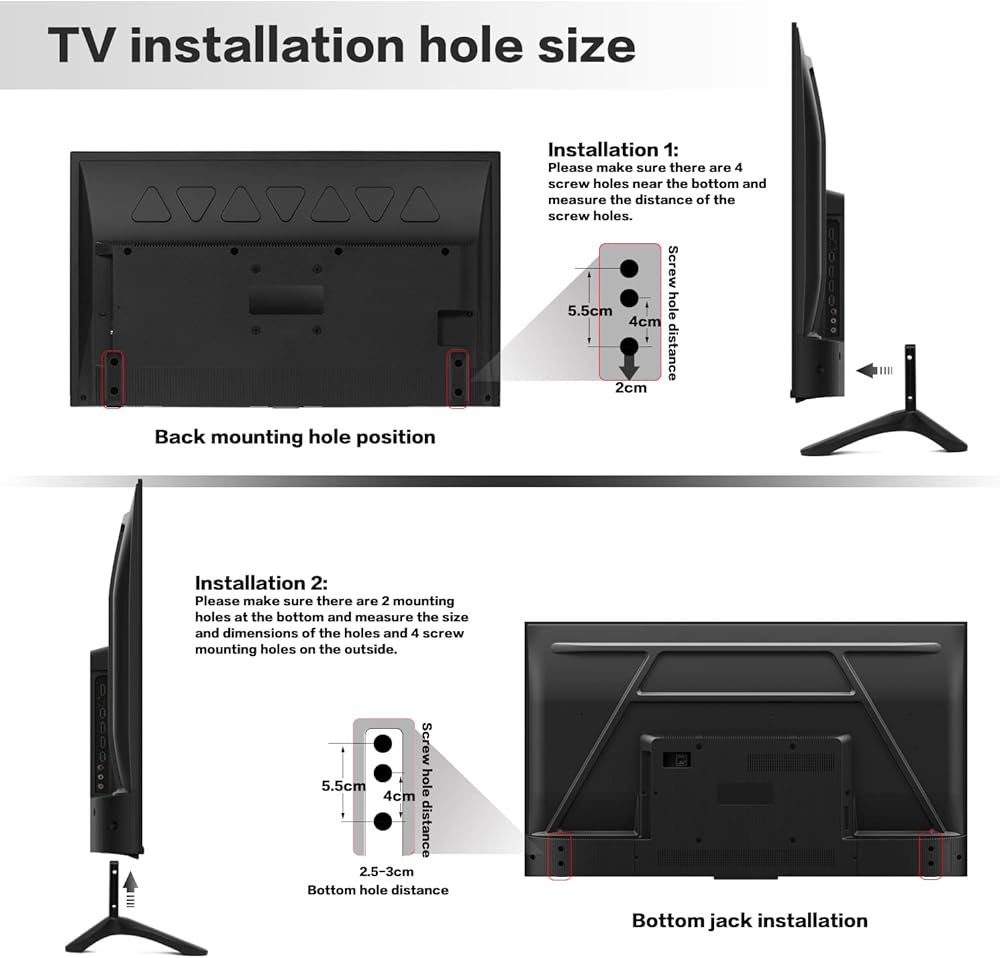 Purchase Note: Before purchasing, please check if there are 2 mounting holes on the left and right side of the back of your TV near the bottom. This TV stand base is suitable for TVs with the distance between the mounting holes between 2.17"/5.5cm and 1.57"/4cm.