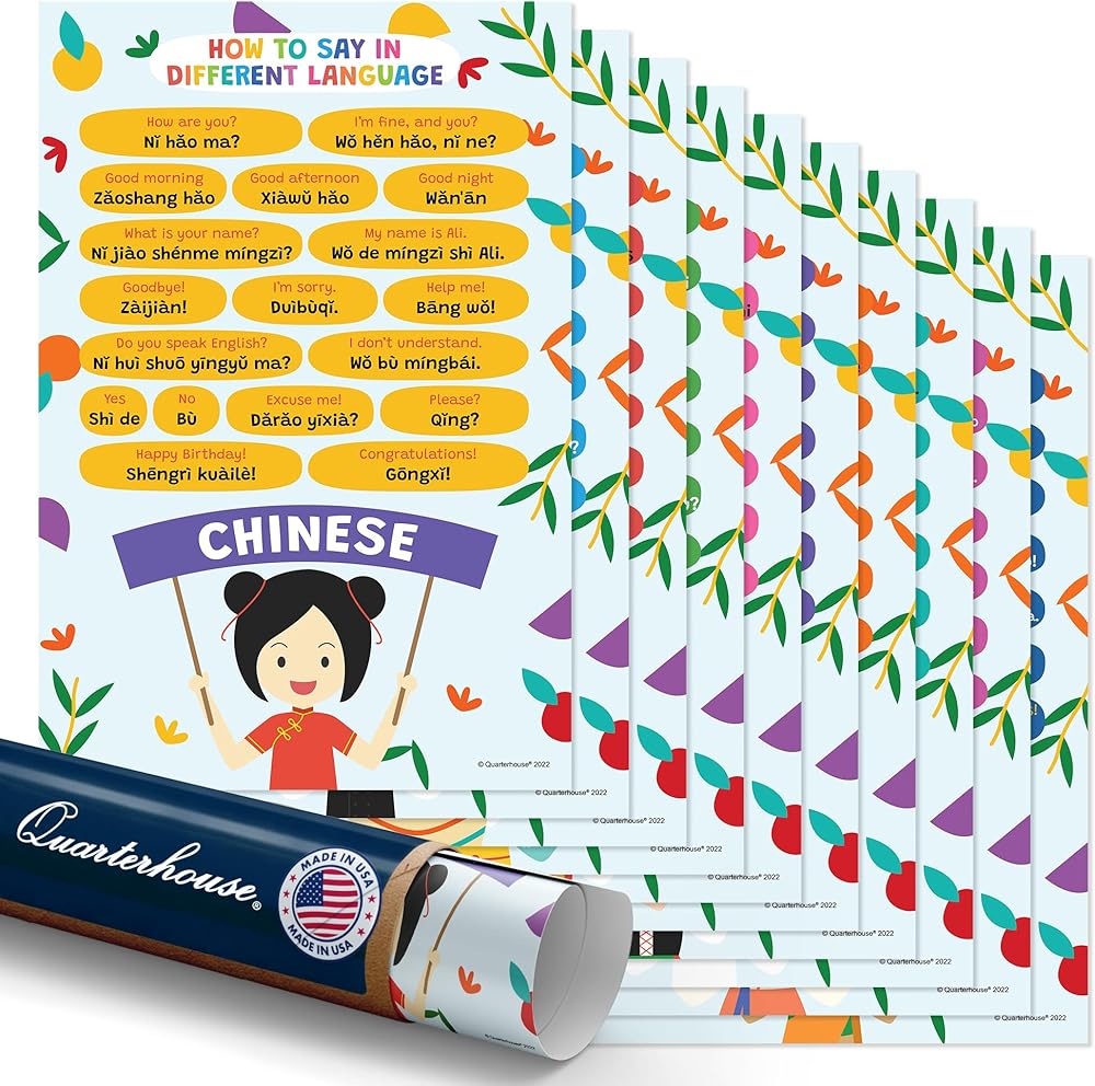 Quarterhouse 10 Poster How to Say in Different Languages Set, Foreign Language Classroom Learning Materials for Pre-K and K-12 Students and Teachers, 12 x 18 Inches, Made in USA