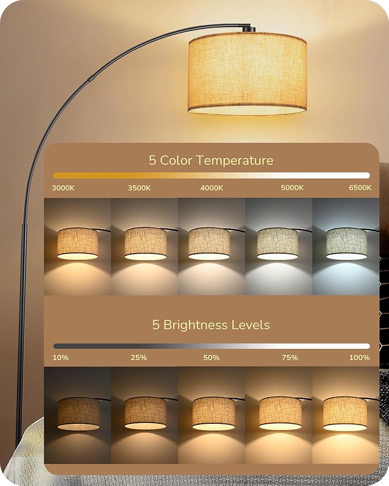 [Dimmable & Stepless Bulb] 12W energy-saving bulb brings comfortable and adjustable light to this tall lamp, 5 levels of dimming: 3000K/3500K/4000K/5000K/6500K, 5 levels of brightness: 10%-25%-50%-75%-100 %, to meet a variety of scenarios, such as reading, feeding, working and night lighting; the memory function can help you remember the last setting