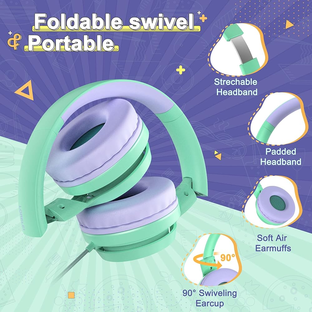 LORELEI E7 Kids Headphones with Micrhophone,On-Ear Wired Headset for Children/Boys/Girls,85/94dB Safe Volume,Foldable 3.5mm Audio Jack Tangle-Free for Scool/iPad/Laptop/Travel (Green&Purple)
