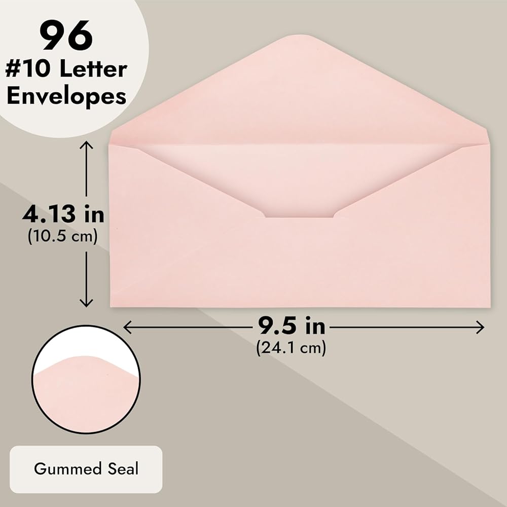 Grab the attention of your clients, friends, and family with our value pack of 96-size 10 envelopes. These colorful #10 envelopes come in 6 assorted colors. The smooth writing surface of the 120gsm paper is ideal for customizing envelopes for craft projects, letters, holiday cards, greeting cards, invites, announcements, and personal mail. These envelopes each measure 4 1/8 x 9 1/2 inches. To seal, apply water to glue the seal on the flap and secure. Our colorful pack of #10 envelopes is perfect for making a statement with your mailings! This pack includes 96 envelopes in six assorted colors, providing you with plenty of options to choose from. Crafted from high-quality 120gsm paper, these envelopes boast a smooth writing surface, making them perfect for creating personalized invites, announcements, holiday cards, and greeting cards. They're also great for crafting projects, providing a blank canvas for your creativity. Measuring 4 1/8 x 9 1/2 inches, these envelopes are the perfect size for a standard letter—the gummed flap help to ensure that your contents stay secure during transit. Whether you're a professional business owner or a creative individual looking to make a statement with your correspondence, these number 10 envelopes are a perfect choice. Grab the attention of your clients, friends, and family with our vibrant value pack. With 96 envelopes in six different colors, you'll have plenty of opportunities to showcase your style and creativity.