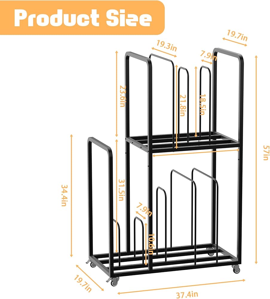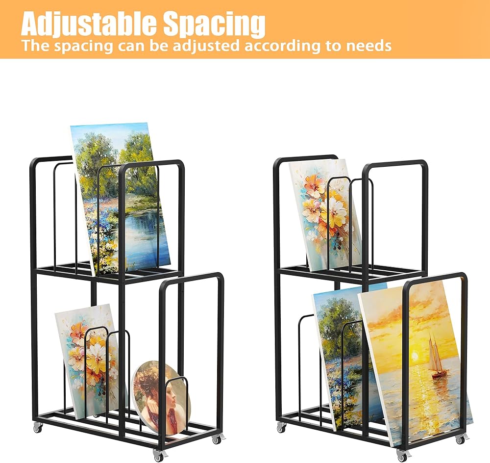 Large Art Canvas Storage Rack with Wheels: The overall size of the art canvas storage rack is 37.4x19.7x57 inches. 2-Tier layered design, making reasonable use of space. There are a total of 8 baffles on the upper and lower layers, and there are holes between each baffle that can be adjusted according to needs