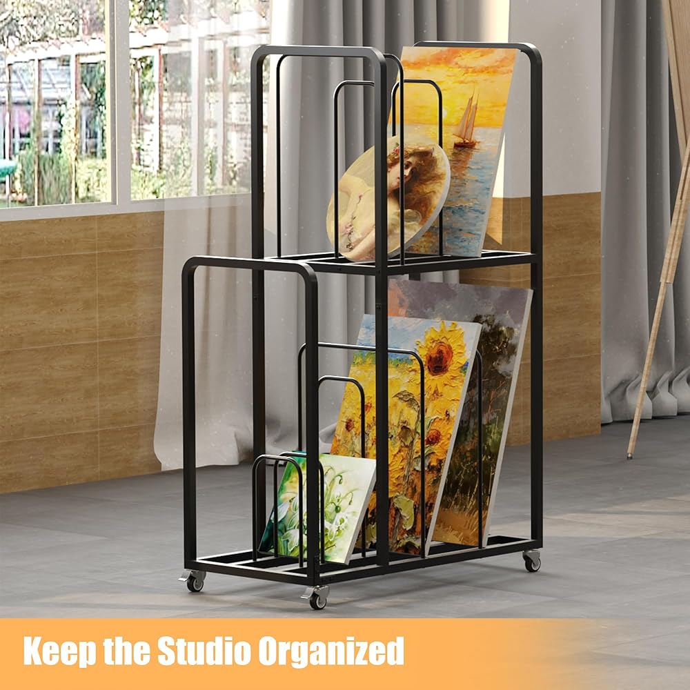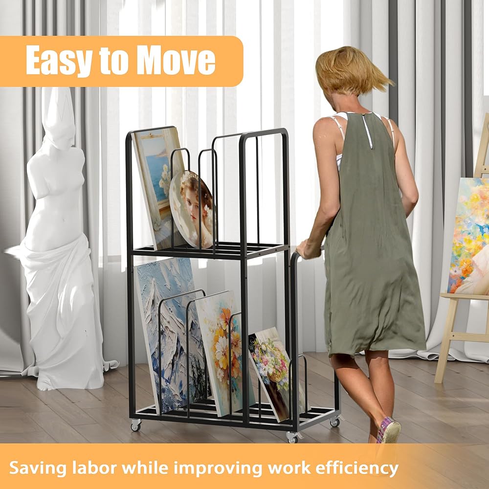 Easy to Move: 2-Tier art drying rack equipped with 4 universal wheels (2 with brake function), you can easily and effortlessly move and secure the canvas storage rack to any area you need. Saving labor while improving work efficiency