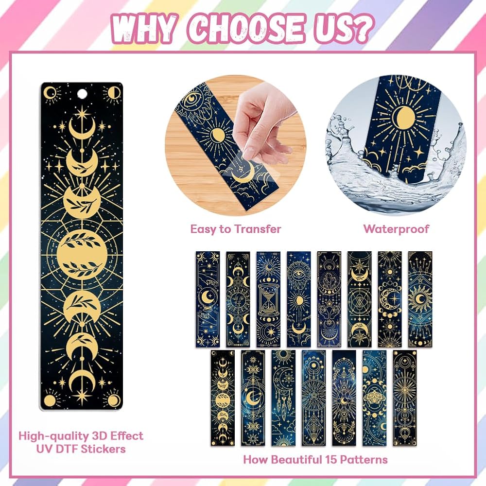 📚️Premium Quality: Our 30pcs(15 patterns, 2pcs per pattern) waterproof UV DTF cold transfer acrylic bookmark wraps feature vibrant and long-lasting designs with high quality HD prints-Ideal for professional and personal use