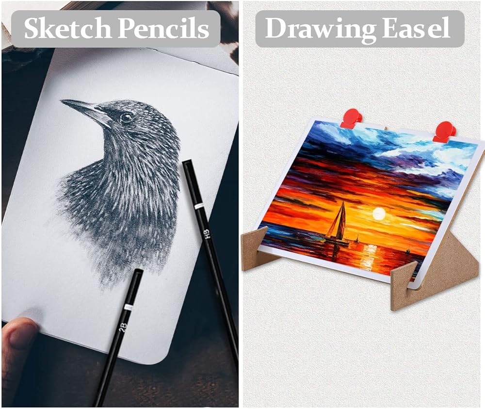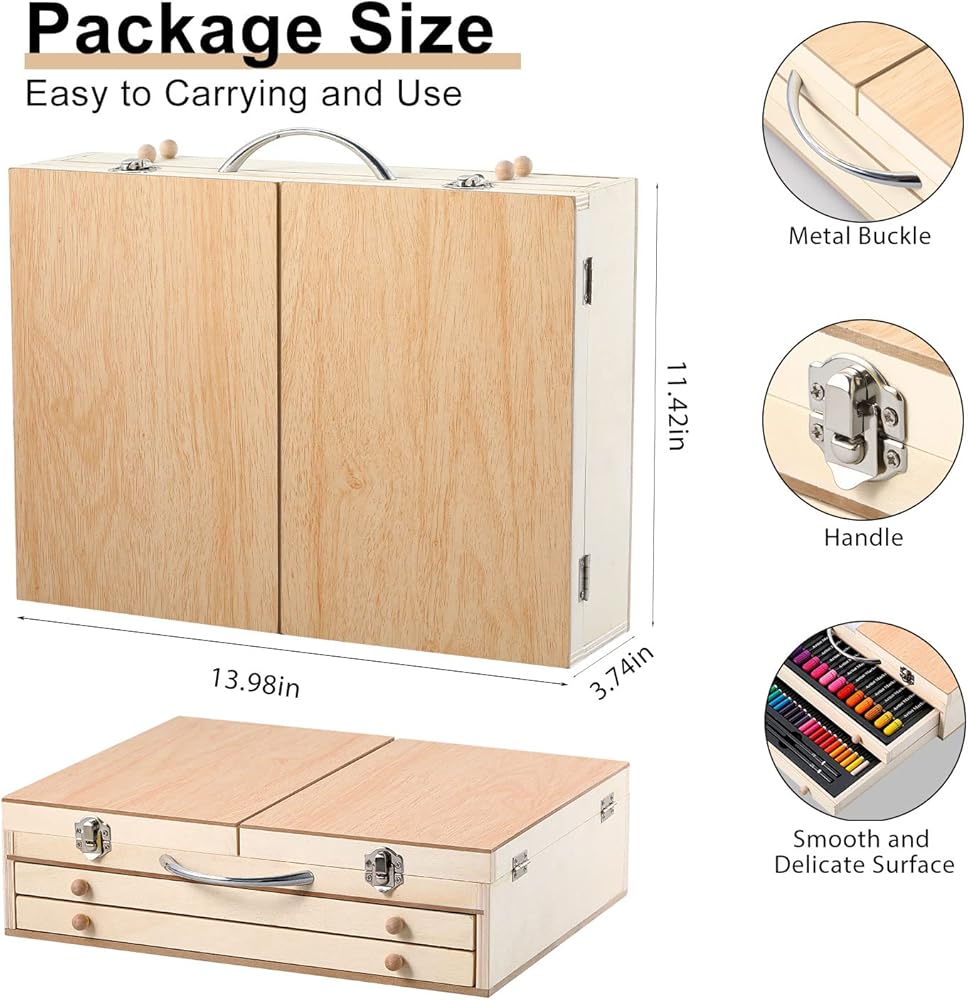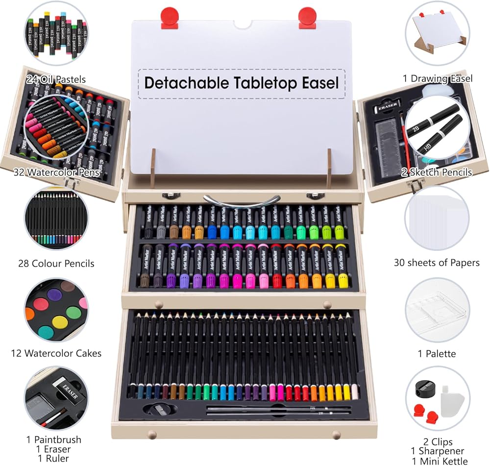 Art Supplies, Deluxe Kids Art Set with Drawing Easel, Crafts Kit in Portable Wooden Case, Oil Pastels, Colored Pencils, Watercolor Cakes, Sketch Paper, Creative Gift for Teens Beginners Girls Boys