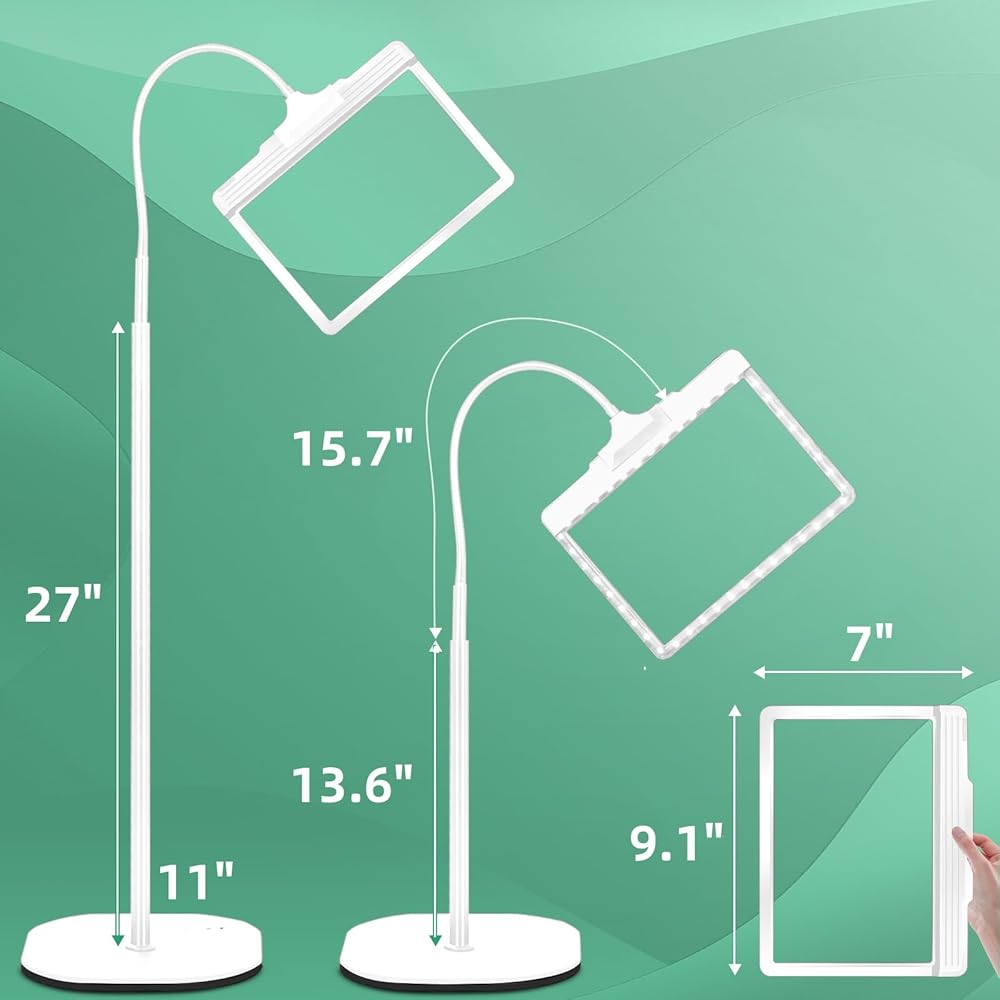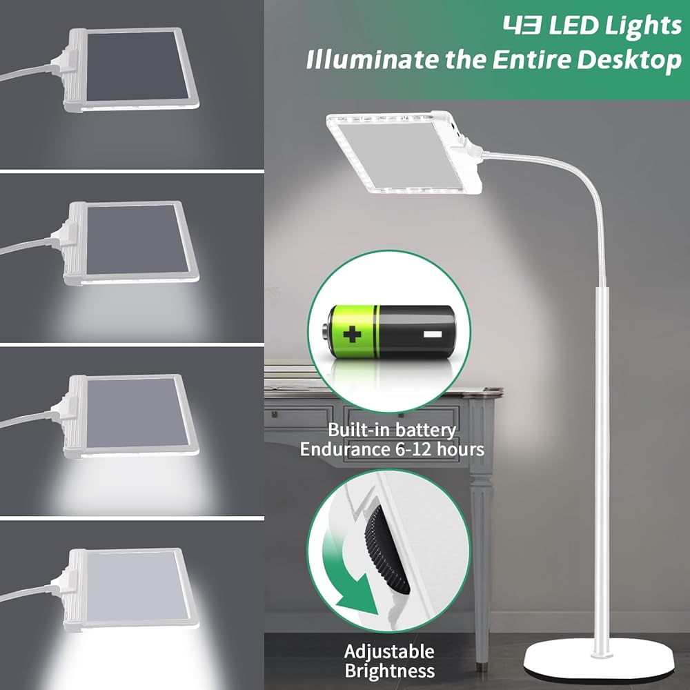 5X Rechargeable Floor Magnifying Glass with Light and Stand,43 LED Flexible Hands Free Magnifying Lamp,2-in-1 Large Lighted Magnifiers for Reading,Sewing,Crafts,Painting,Close Work,DIY White