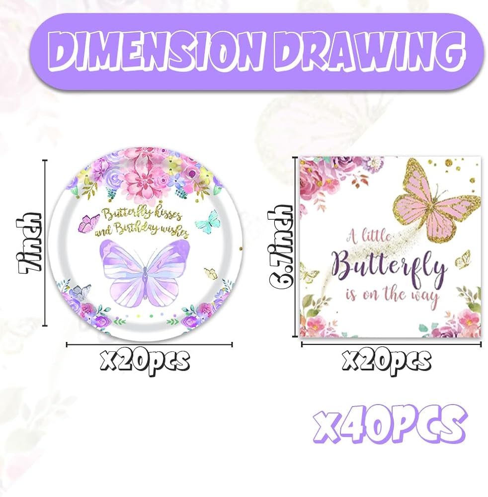 40Pcs Butterfly Baby Shower Decorations Tableware Set Butterfly Floral Disposable Plates Napkins Serves 20 A Little Butterfly Is On Her Way Baby Shower Party Decorations