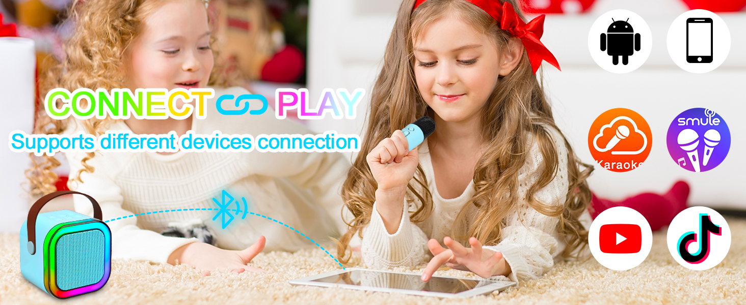 Multi-functional Children's Karaoke - Sound Pairing with 2 Microphones, Built-in 5.0 Bluetooth Connectivity for Instant Device Pairing and Stable Performance. It can connect to various devices like phones, tablets, and laptops via Bluetooth. It also supports TF card, USB cable, and headphone output port. The speakers and microphones will automatically connect when powered on.