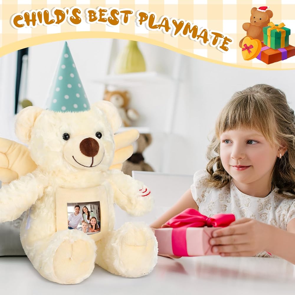 Package Contents: you will receive 1 angel bear, equipped with a recorder with standing height of about 12 inches/ 30 cm, sitting height of about 10 inches/ 25 cm, adorned with angel designs and a photo frame that can hold a photo or a letter of about 3.2 x 3.2 inches; The built in recorder allows you to record some warm greetings, which makes it cute and eye catching, making it a favorite among most people