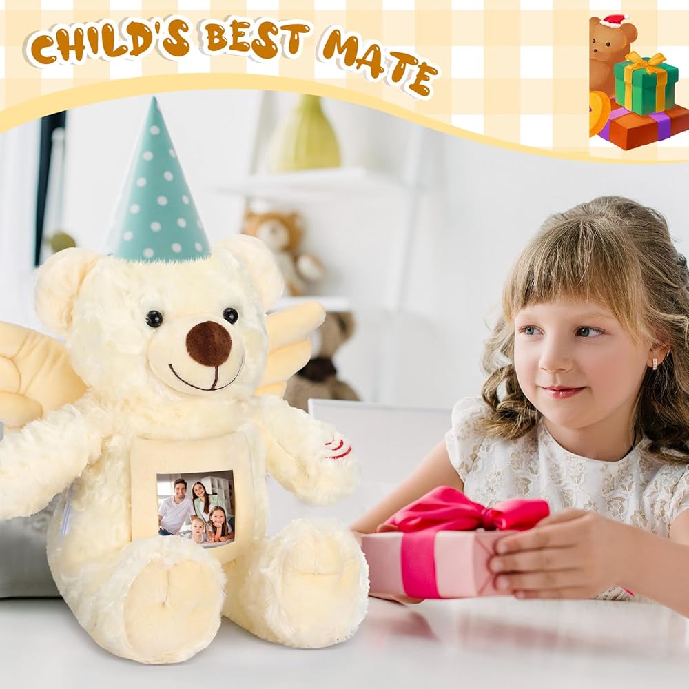 Leyndo 12 Inch Angel Remembrance Bear Plush Stuffed Animal with Recorder Soft Plush Animal Toy with a Picture Frame for Baby Shower Birthday Party Wedding Gift(Cream)