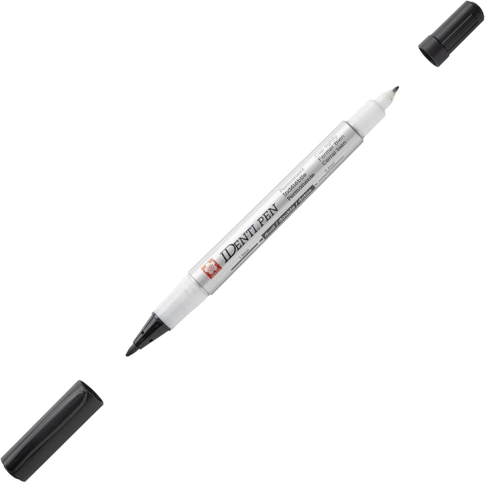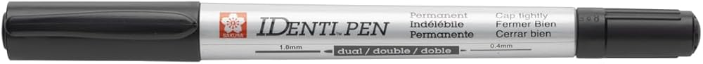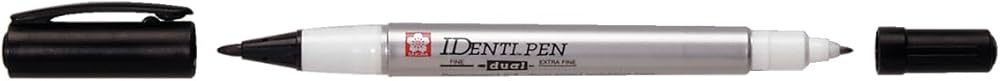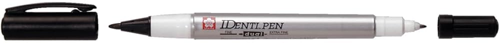 Identic-pen features a dual point and Leaves a permanent mark on most nonporous surfaces. One end is for details, with an extra fine plastic point that won't break down. The opposite end is for broader lines, with a tough fiber point built for heavy use. Waterproof pen writes on leather, metal, wood, glass, CDs, plastic, and photographs. The ink is low-odor and resistant to water. Alcohol-based cleaners will remove ink from nonporous surfaces. Identic-pen meets nontoxicity requirements.