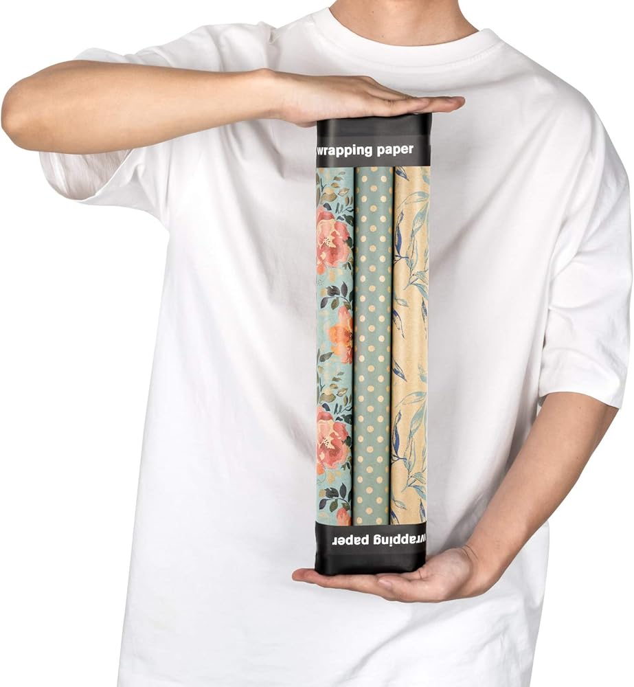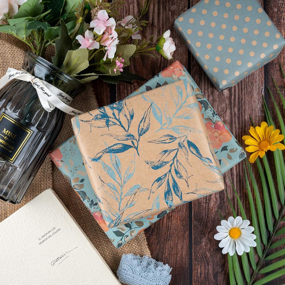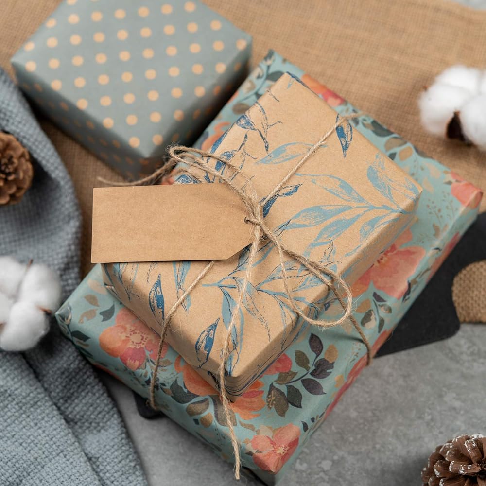 Package: 3 rolls kraft wrapping paper in spring style come with gift tags, jute string, perfect set for gift wrapping