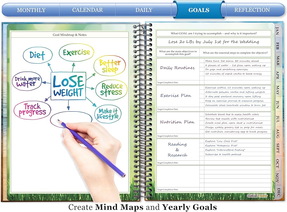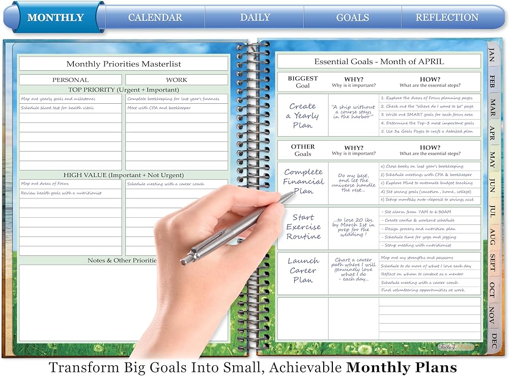 Funnel Goals into Daily Action Plans - Break down big goals into manageable daily weekly and monthly planner sections with large 2-page planner spreads in a classic vertical layout