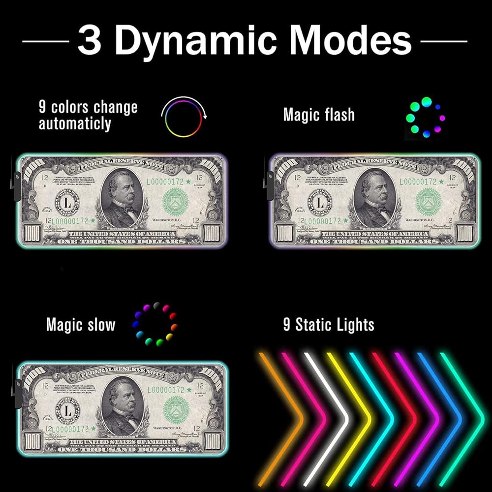 ✅ includes 9 kinds of static lighting modes and 3 dynamic lighting modes, plug and play, no driver required. One button, press one time to change the Lighting mode, press twice to change the brightness, press and hold about 3 seconds turn on,off. This LED RGB Mouse Pad can create a cool gaming atmosphere through Choosing the color mode.