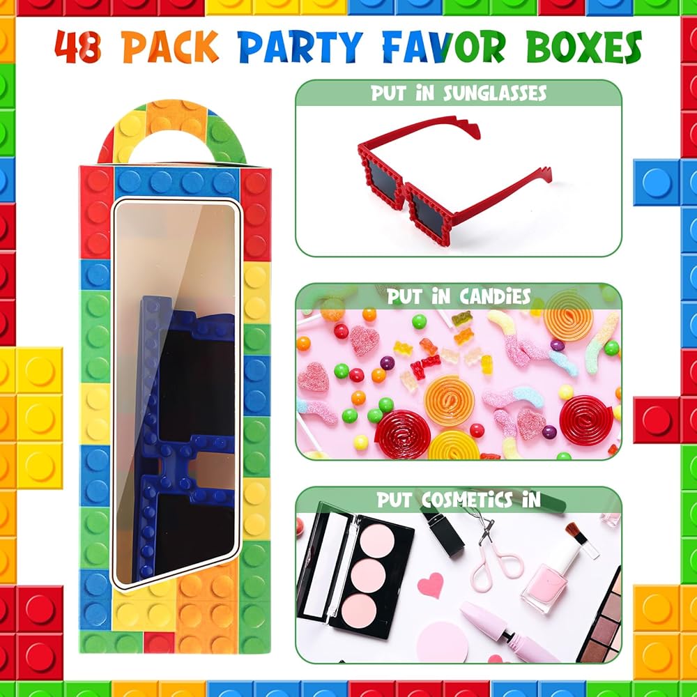 Durable Material: these building theme gift boxes are made of cardboard and transparent PVC, easy to assemble or disassemble, not easily damaged or faded; The durable PC material of the building block sunglasses ensures their lifespan, making them suitable for birthdays, Christmas, bridal showers, or other parties