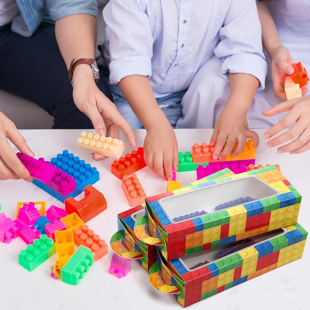Building Bricks Party Gift Box: our building party gift box comes with a transparent window and circular handle, measuring approximately 7.52 x 2.91 x 1.89 inches/19.1 x 7.4 x 4.8 centimeters, making it both cute and practical; The dimensions ensure an ample capacity to nestle a broad variety of party items, such as candy, makeup, sunglasses, accessories, headbands, etc.the transparent design allows you to see what is inside; The size and design optimize portability, It's an ideal party gift