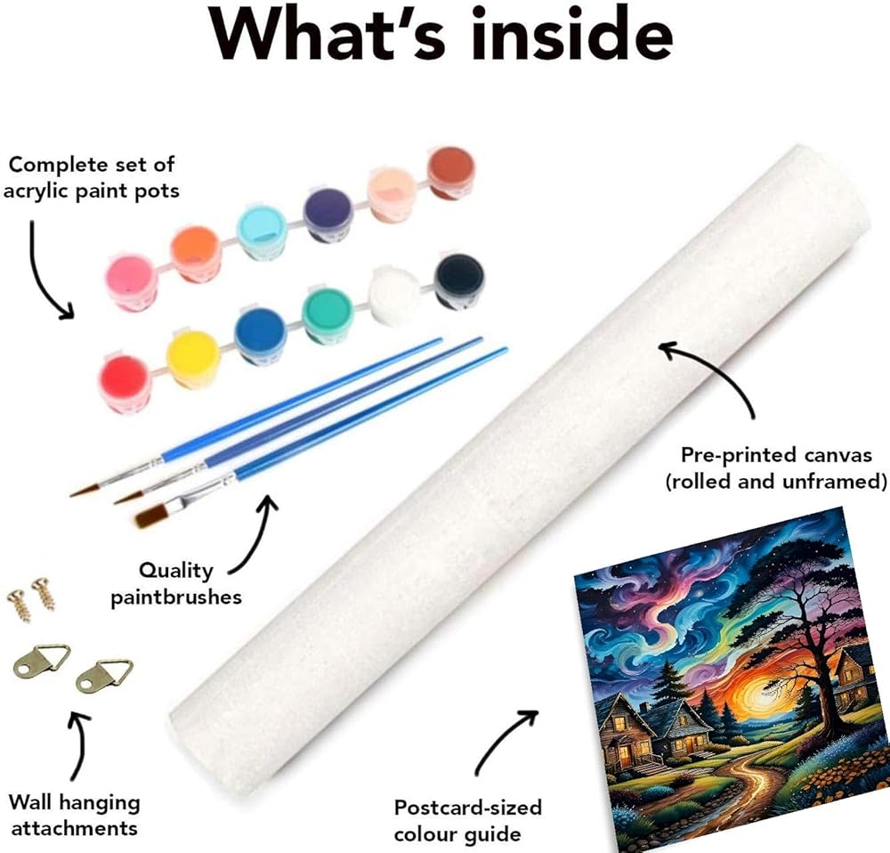 Paint by number kits include:The paint by number for adults includes a 16 x 20 inch high-quality canvas(without frame),1 pc pre-printed textured art canvas Starry paint by number kits ,1 set acrylic paints,1 set paint by numbers brushes(include 3pcs).and country night paint by number accessories,hook + number drawing paper guide.