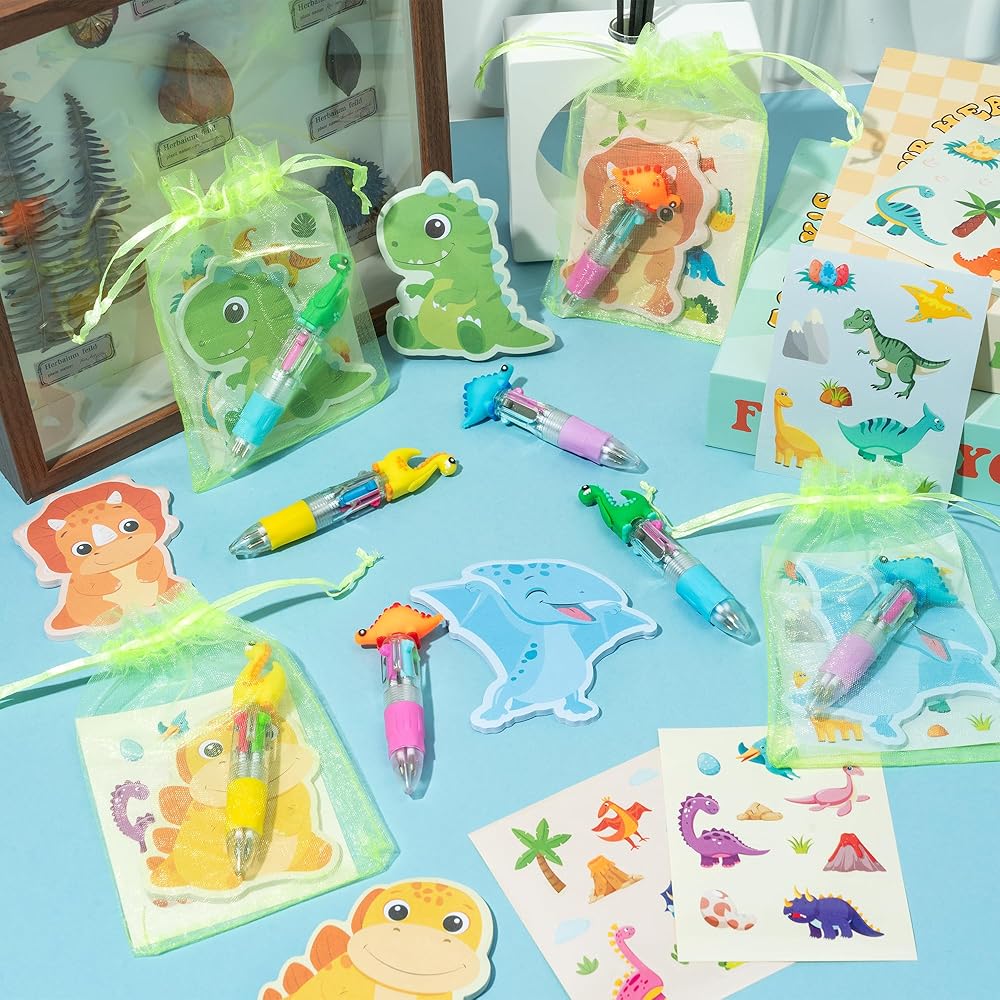CY2SIDE Dinosaur Stationery Party Gift - 12 Pack Spring Stuffers Prizes with Dino 4-in-1 Ballpoint Pens Sticky Notes Stickers and Organza Animal Summer Party Favor Goodie Bag Fillers for School Reward