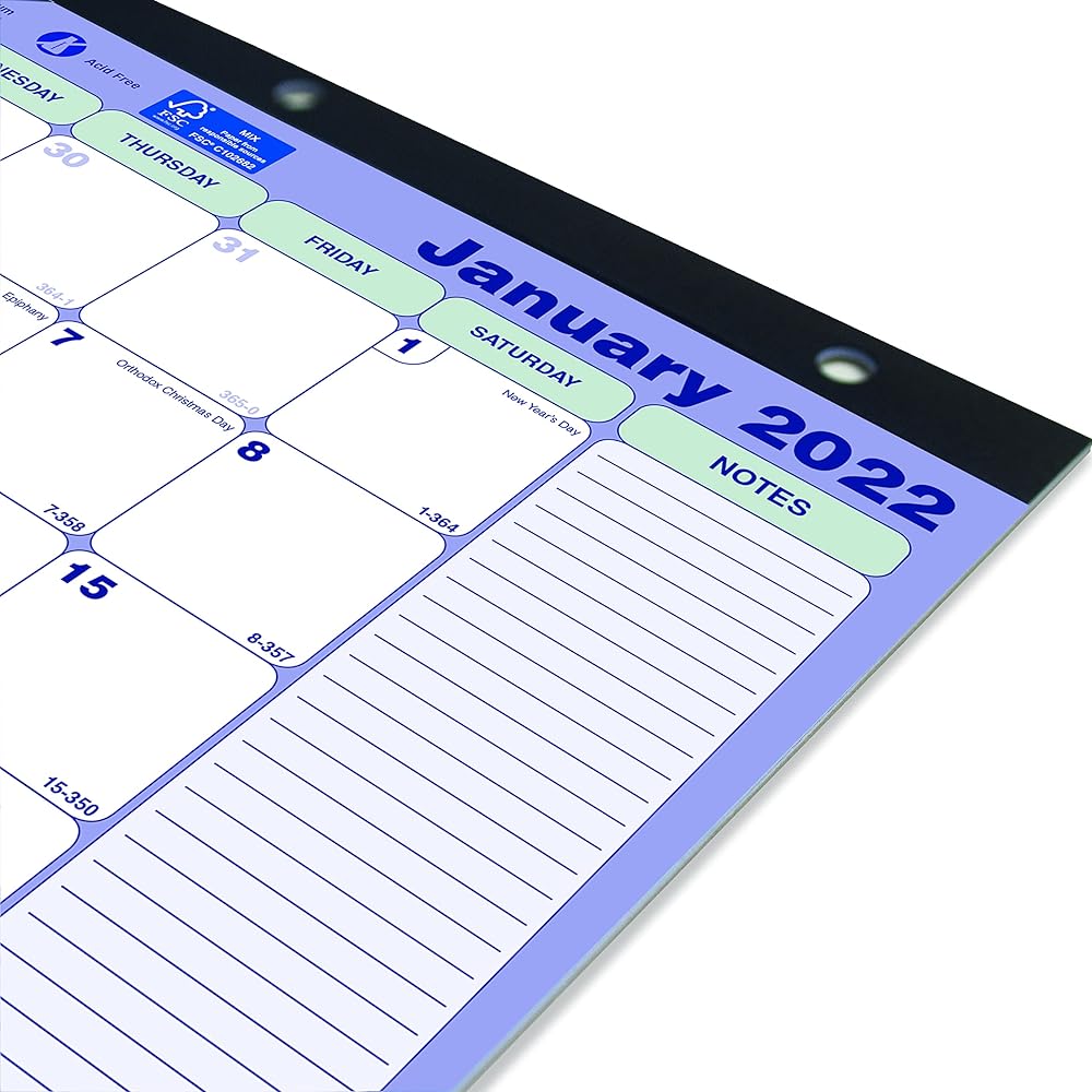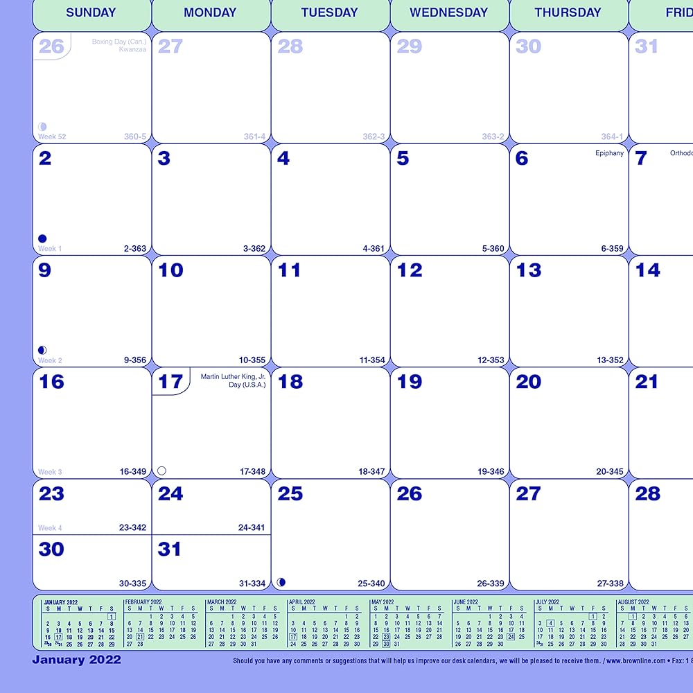 Features: numbered weeks, countdown of days passed and days to come (Julian dates), highlights holidays and phases of the moon