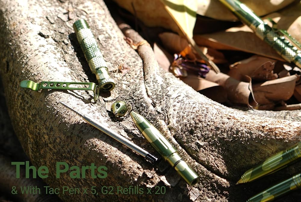 【Package Includes】One package contains 3 pcs AL01 green camouflage tactical pen and 12 pcs black G2 refills.
