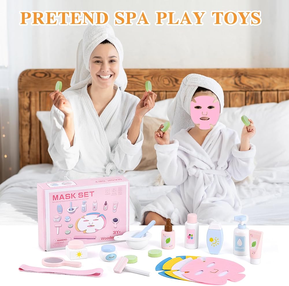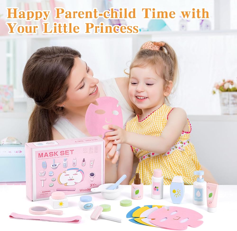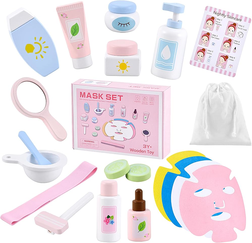 18PCS Wooden Toys Makeup Kit : The wooden beauty salon play set with storage bag will come to you with a mirror, razor, 2* eye masks, 2* face creams, sunscreen, facial cleanser, facial toner, essence, face mask mixing bowl, mask stick, hair band, 4* masks.