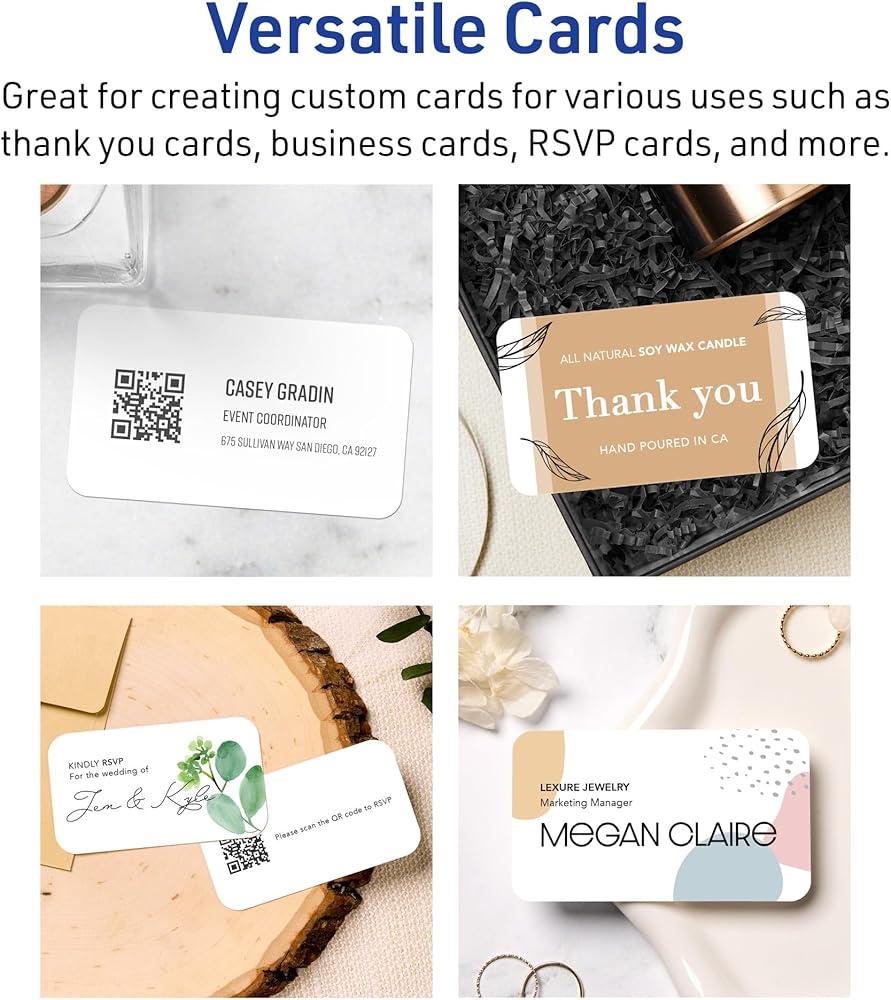Easily create and print your own business cards, insert cards, thank you cards, and more with Avery 2" x 3.5" matte white rectangle rounded corner cards. These versatile cards are perfect for table cards, seating cards, coupon cards, appointment cards, loyalty cards, and more. Created with heavyweight and durable 80 lb / 216 gsm cardstock, the matte white material is a versatile fit for any project or event. Printable on both sides and compatible with laser and inkjet printers, the cards let you create professional designs with a desktop printer. Avery rectangle rounded corner cards are carefully constructed with useful features to provide the best results. Sure Feed technology reduces jams or smudges by creating a more reliable feed through your printer. Easily customize cards with your own logos, art, symbols, and messaging by using the templates and designs in Avery Design & Print on the Avery site. Whether you're a business owner that wants to add more flair to products, a party organizer trying to elevate an event, or a teacher looking to step up class projects, Avery cards make it easy to translate your designs into reality.